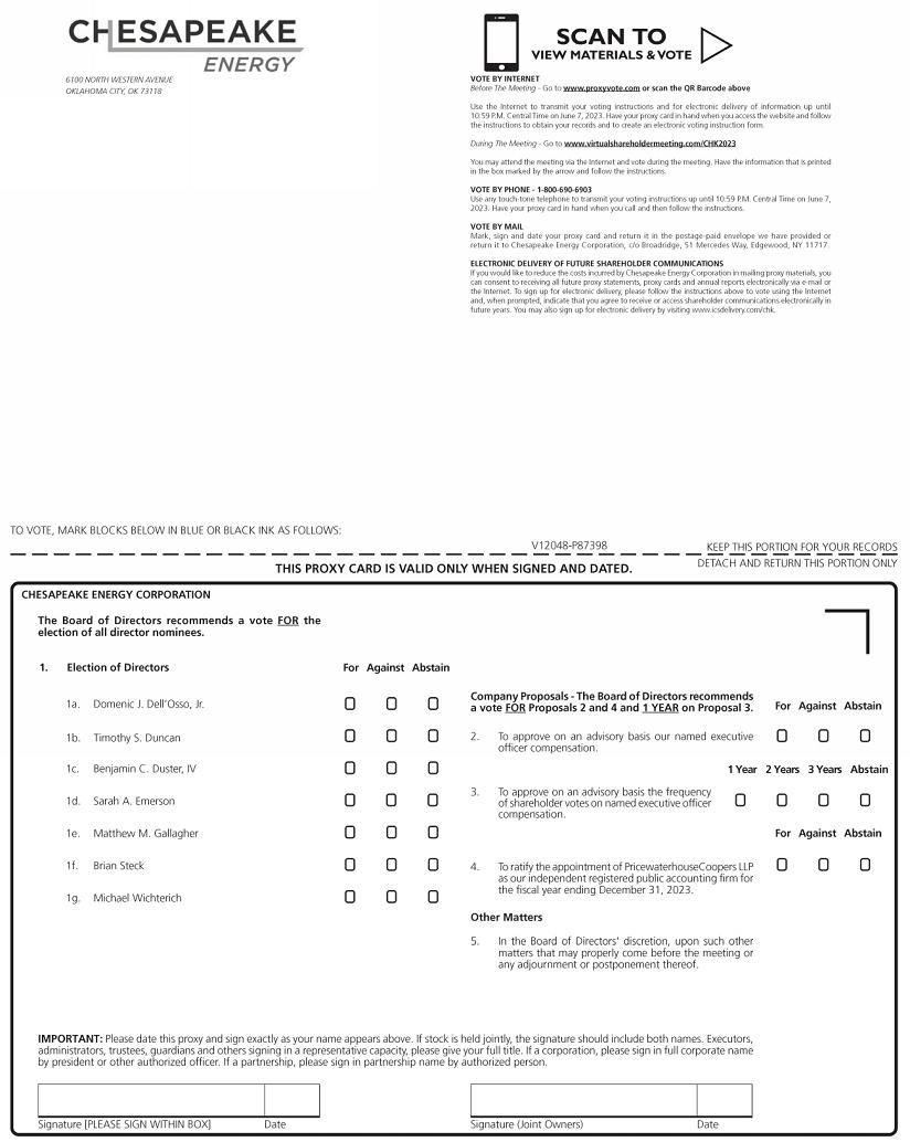 Signature [PLEASE SIGN WITHIN BOX] Date Signature (Joint Owners) Date TO VOTE, MARK BLOCKS BELOW IN BLUE OR BLACK INK AS FOLLOWS: KEEP THIS PORTION FOR YOUR RECORDS THIS PROXY CARD IS VALID ONLY WHEN SIGNED AND DATED. DETACH AND RETURN THIS PORTION ONLY V12048-P87398 For Against Abstain For Against Abstain ! ! ! For Against Abstain ! ! ! ! ! ! ! ! ! ! ! ! ! ! ! ! ! ! ! ! ! ! ! ! CHESAPEAKE ENERGY CORPORATION 6100 NORTH WESTERN AVENUE OKLAHOMA CITY, OK 73118 3. To approve on an advisory basis the frequency of shareholder votes on named executive officer compensation. The Board of Directors recommends a vote FOR the election of all director nominees. Company Proposals - The Board of Directors recommends a vote FOR Proposals 2 and 4 and 1 YEAR on Proposal 3. Other Matters 1. Election of Directors 1b. Timothy S. Duncan 1c. Benjamin C. Duster, IV 1d. Sarah A. Emerson 1e. Matthew M. Gallagher 1f. Brian Steck 1g. Michael Wichterich 2. To approve on an advisory basis our named executive officer compensation. 4. To ratify the appointment of PricewaterhouseCoopers LLP as our independent registered public accounting firm for the fiscal year ending December 31, 2023. 5. In the Board of Directors' discretion, upon such other matters that may properly come before the meeting or any adjournment or postponement thereof. IMPORTANT: Please date this proxy and sign exactly as your name appears above. If stock is held jointly, the signature should include both names. Executors, administrators, trustees, guardians and others signing in a representative capacity, please give your full title. If a corporation, please sign in full corporate name by president or other authorized officer. If a partnership, please sign in partnership name by authorized person. 1a. Domenic J. Dell’Osso, Jr. ! ! ! ! 1 Year 2 Years 3 Years Abstain VOTE BY INTERNET Before The Meeting - Go to www.proxyvote.com or scan the QR Barcode above Use the Internet to transmit your voting instructions and for electronic delivery of information up until 10:59 P.M. Central Time on June 7, 2023. Have your proxy card in hand when you access the website and follow the instructions to obtain your records and to create an electronic voting instruction form. During The Meeting - Go to www.virtualshareholdermeeting.com/CHK2023 You may attend the meeting via the Internet and vote during the meeting. Have the information that is printed in the box marked by the arrow and follow the instructions. VOTE BY PHONE - 1-800-690-6903 Use any touch-tone telephone to transmit your voting instructions up until 10:59 P.M. Central Time on June 7, 2023. Have your proxy card in hand when you call and then follow the instructions. VOTE BY MAIL Mark, sign and date your proxy card and return it in the postage-paid envelope we have provided or return it to Chesapeake Energy Corporation, c/o Broadridge, 51 Mercedes Way, Edgewood, NY 11717. ELECTRONIC DELIVERY OF FUTURE SHAREHOLDER COMMUNICATIONS If you would like to reduce the costs incurred by Chesapeake Energy Corporation in mailing proxy materials, you can consent to receiving all future proxy statements, proxy cards and annual reports electronically via e-mail or the Internet. To sign up for electronic delivery, please follow the instructions above to vote using the Internet and, when prompted, indicate that you agree to receive or access shareholder communications electronically in future years. You may also sign up for electronic delivery by visiting www.icsdelivery.com/chk. SCAN TO VIEW MATERIALS & VOTE