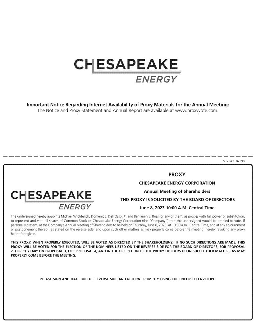 V12049-P87398 Important Notice Regarding Internet Availability of Proxy Materials for the Annual Meeting: The Notice and Proxy Statement and Annual Report are available at www.proxyvote.com. PLEASE SIGN AND DATE ON THE REVERSE SIDE AND RETURN PROMPTLY USING THE ENCLOSED ENVELOPE. PROXY CHESAPEAKE ENERGY CORPORATION Annual Meeting of Shareholders THIS PROXY IS SOLICITED BY THE BOARD OF DIRECTORS June 8, 2023 10:00 A.M. Central Time The undersigned hereby appoints Michael Wichterich, Domenic J. Dell’Osso, Jr. and Benjamin E. Russ, or any of them, as proxies with full power of substitution, to represent and vote all shares of Common Stock of Chesapeake Energy Corporation (the “Company”) that the undersigned would be entitled to vote, if personally present, at the Company’s Annual Meeting of Shareholders to be held on Thursday, June 8, 2023, at 10:00 a.m., Central Time, and at any adjournment or postponement thereof, as stated on the reverse side, and upon such other matters as may properly come before the meeting, hereby revoking any proxy heretofore given. THIS PROXY, WHEN PROPERLY EXECUTED, WILL BE VOTED AS DIRECTED BY THE SHAREHOLDER(S). IF NO SUCH DIRECTIONS ARE MADE, THIS PROXY WILL BE VOTED FOR THE ELECTION OF THE NOMINEES LISTED ON THE REVERSE SIDE FOR THE BOARD OF DIRECTORS, FOR PROPOSAL 2, FOR “1 YEAR” ON PROPOSAL 3, FOR PROPOSAL 4, AND IN THE DISCRETION OF THE PROXY HOLDERS UPON SUCH OTHER MATTERS AS MAY PROPERLY COME BEFORE THE MEETING.