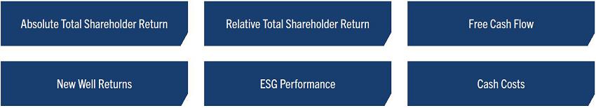 | EXECUTIVE COMPENSATION // 39 Name 2022 Base Salary ($) Annual Incentive Program Target as % of Base Annual Incentive Program at Target (100% Performance Metrics Achieved) ($) 200% Performance Achievement ($) Domenic J. (“Nick”) Dell’Osso, Jr. 800,000 125 1,000,000 2,000,000 Mohit Singh 525,000 100 525,000 1,050,000 Joshua J. Viets 490,000 100 490,000 980,000 Benjamin E. Russ 400,000 80 320,000 640,000 Michael A. Wichterich(a) 650,000 – – – (a) Mr. Wichterich does not participate in the AIP. 2022 AIP Performance Goals and Calculation of Payout Factor For the 2022 AIP, the Compensation Committee established the performance goals detailed in the table below, which it believed appropriately focused on the value drivers and discipline that our shareholders value. Each metric was focused on delivery of one of the following three corporate objectives: The 2022 AIP metrics are designed to incentivize our manage-ment team to maximize free cash flow and optimize profitabil-ity while improving our environmental and safety performance. Goals for these metrics were established by the Committee in April 2022. The Committee designed the AIP to be comple-mentary to our long-term incentive plan. Because the long-term incentive plan is entirely weighted towards total shareholder re-turns (TSR), which is heavily influenced by commodity prices, the Committee selected performance metrics that were more under management control. In addition, the Committee included an ESG “gate” as part of the AIP in order to properly emphasize the importance of ESG matters. The ESG “gate” requires threshold levels of all ESG per-formance measures to be met before the payout associated with any performance metric can exceed the target level, except that with respect to the Total Recordable Incident Rate (“TRIR”) goal, the “gate” was based on employee TRIR only instead of the TRIR of employees and contractors. Threshold, target and maximum levels were determined by the Committee based on a review of the Company’s approved budget and historical performance, where available. The Committee determined the weighting for each performance goal by considering the drivers of our business and each goal’s impact on our business. The Committee desig-nated the generation of free cash flow, new well returns and ESG as our three top priorities and assigned the highest weighting (20% each) to these measures. The Committee assigned a 10% weighting to the performance of our oil and gas base production and to profit optimization in the form of cash costs. Range of Annual Incentive Payout Metrics The following table sets forth the range of payments under our AIP for 2022 for our NEOs if executives had achieved only target per-formance, as well as an example of payout at the 200% performance level. ESG + Cash Generation + Cost & Efficiency 23-2075-2 C2.1 P41 |