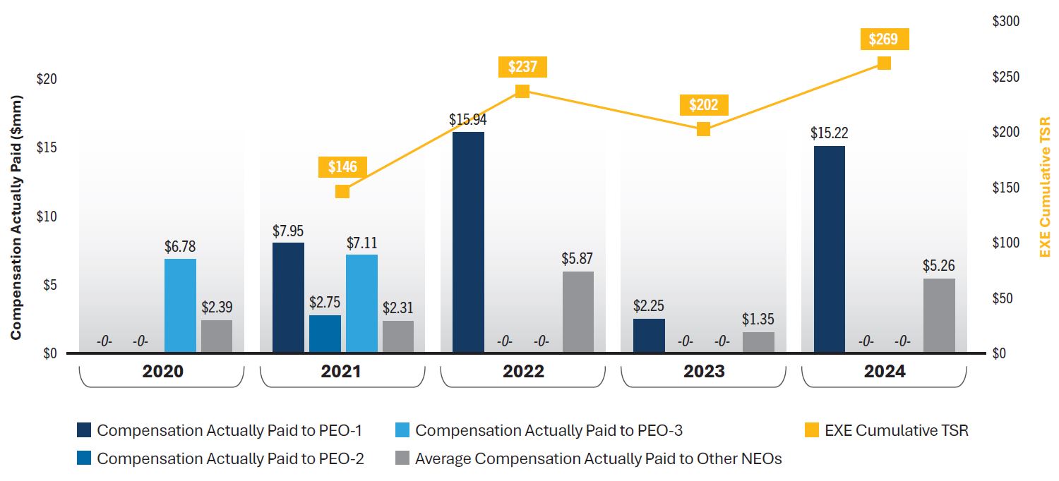 | 40 Expand Energy 2025 Proxy Statement WHAT WE DO WHAT WE DON’T DO • Pay for Performance. Long-term incentive awards vest over several years to incentivize and reward sustained performance in concert with our pay-for-performance philosophy. • Shareholder Engagement. Fulsome year-round engagement with shareholders on compensation and other topics of import. • Stock Ownership Guidelines. Our NEOs are subject to a minimum equity ownership requirement, ensuring direct alignment with shareholder interests. • Clawback Policy. If we restate our financial statements, other than as a result of changes to accounting rules or regulations, we may recoup cash and equity incentive compensation. • Double-Trigger Change-in-Control Provisions. In the event of a change in control, cash severance and LTIP awards are paid only if an actual or constructive termination occurs. • Annual Risk Assessments. The Compensation Committee evaluates the relationship between compensation and corporate risk. • Peer Group Comparison. We compare executive compensation against industry compensation practices to drive distinguished relative performance. • Independent Compensation Consultant. The Compensation Committee retains its own independent consultant to advise on compensation matters. • No Excessive Risk Taking. Our compensation programs are designed to deter excessive risk taking. • No Tax Gross-Ups. Our severance agree-ments contain no tax gross-ups for NEOs. • No Automatic Base Salary Increases. Our NEOs’ base salaries are reviewed annually, and decisions are based on demonstrated individual performance, business conditions and external market data provided by our independent compen-sation consultant. • No Hedging or Pledging of EXE Stock. Our policies prohibit the pledging and hedging of our stock by our executives and directors. • No Employment Agreements. Each NEO is employed at-will. Compensation Governance Best Practices Primary Executive Compensation Elements for 2024 Expand Energy is committed to maintaining performance-driven compensation programs designed to attract, retain, and appropriately reward top talent while ensuring strong alignment between compensation and performance metrics that drive sustainable shareholder value. Our Compensation Committee aims to strike an appropriate balance between fixed and “at risk” compensation and implements our pay-for-performance philosophy by linking a significant portion of each NEO’s compensation to Company performance and indi-vidual contributions. COMPENSATION COMPONENT DELIVERY METHOD PURPOSE Fixed Base Salary Cash Competitively compensate executives to reflect levels of responsibility and contribution to the Company’s success Performance Based and Variable Annual Incentive Awards Cash Provide an incentive focused on one-year performance of established metrics Long-Term Incentive Awards PSUs — stock settled 75% of total value Focus executives on delivery of longer-term measures designed to drive enhanced absolute and relative shareholder value RSUs 25% of total value Further align executives with shareholders and reinforce an “owner’s” perspective as our executives manage the business |