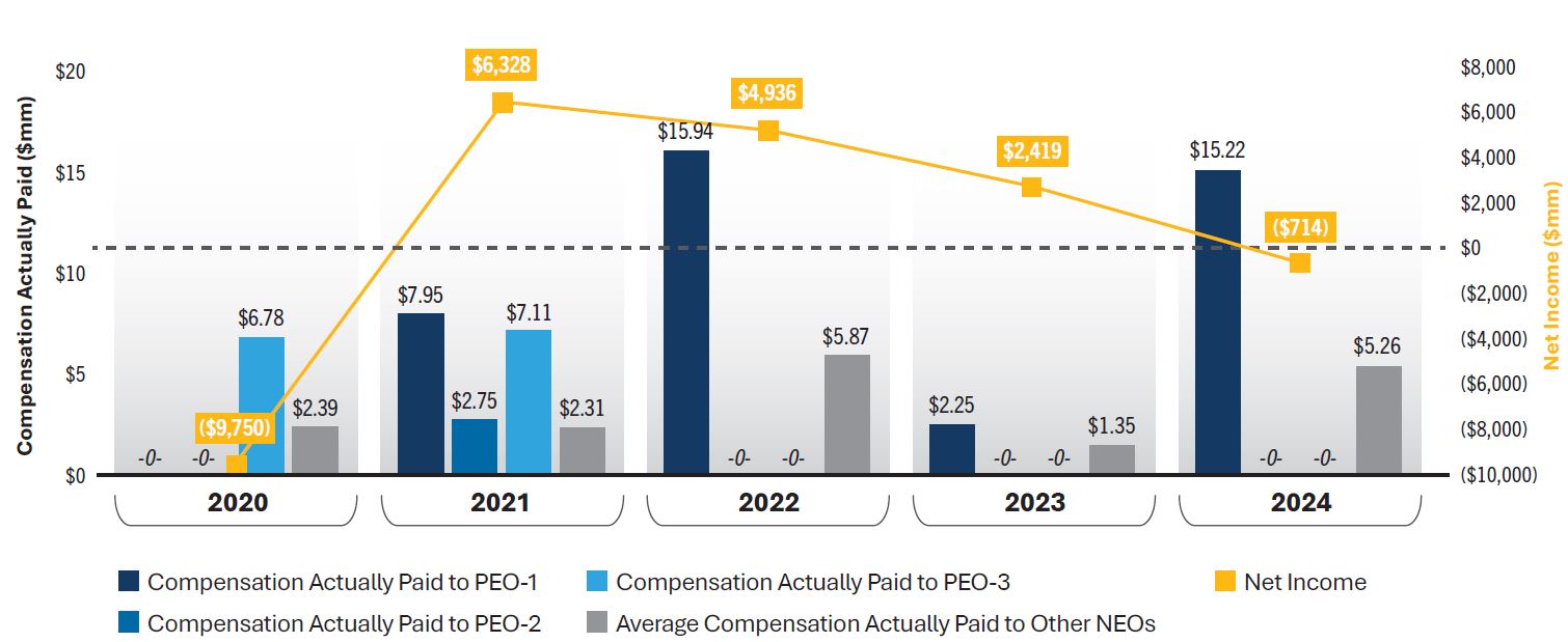 This disclosure does not necessarily reflect the realized value of executive compensation or how our Compensation Committee makes decisions. CAP has been calculated for our Principal Executive Officers and Other NEOs for the fiscal years ended December 31, 2020, 2021, 2022, 2023 and 2024. For further details, please see our Compensation Committee Philosophy on page 39.