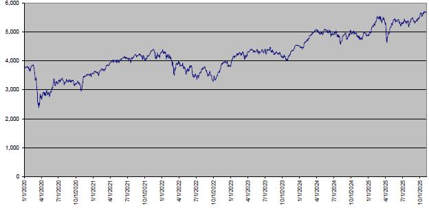 The following graph sets forth the daily Closing Levels of the Underlier for each quarter in the period from January 1, 2020 through November 3, 2025. The Closing Level of the Underlier on November 3, 2025 was 5,679.25. We obtained the information in the graph below from Bloomberg Financial Markets without independent verification. The Underlier has at times experienced periods of high volatility. The actual performance of the Underlier over the term of the notes, as well as the amount payable at maturity, may bear little relation to the historical Closing Levels of the Underlier or to the hypothetical return examples set forth herein. We cannot predict the future performance of the Underlier. You should not take the historical levels of the Underlier as an indication of its future performance, and no assurance can be given as to the Closing Level of the Underlier on the Determination Date.