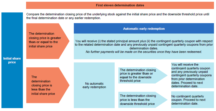 If, on any of the first eleven determination dates, the determination closing price of the underlying stock is greater than or equal to the initial share price, the securities will be automatically redeemed for an early redemption payment on the third business day following the related determination date, as set forth under “Determination Dates, Contingent Payment Dates and Early Redemption Dates” below. No further payments will be made on the securities once they have been redeemed. |