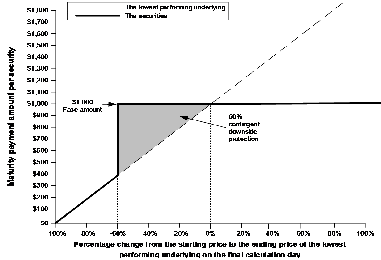 ●if the ending price of each underlying is greater than or equal to its respective downside threshold price: $1,000; or ●if the ending price of any underlying is less than its respective downside threshold price: $1,000 × performance factor of the lowest performing underlying on the final calculation day |