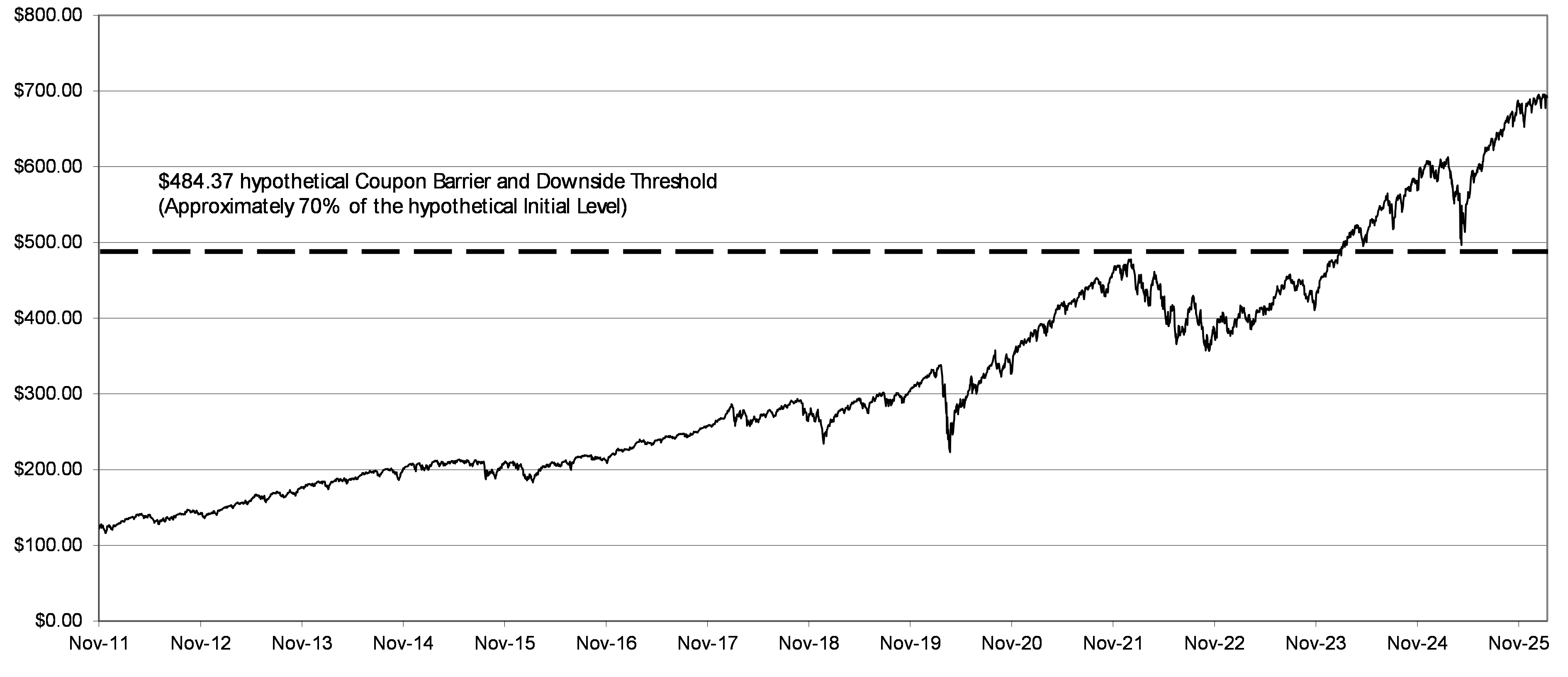 The graph below illustrates the daily performance of the State Street® SPDR® S&P 500® ETF and the Invesco KBW Bank ETF from November 1, 2011 through February 9, 2026. For comparison purposes, each of the Underlying Shares has been “normalized” to have a closing price of $100 on November 1, 2011 by dividing the closing price of such Underlying Shares on each Trading Day by the closing price of such Underlying Shares on November 1, 2011 and multiplying by 100. We obtained the closing price used to determine the normalized closing price set forth below from Bloomberg, without independent verification.