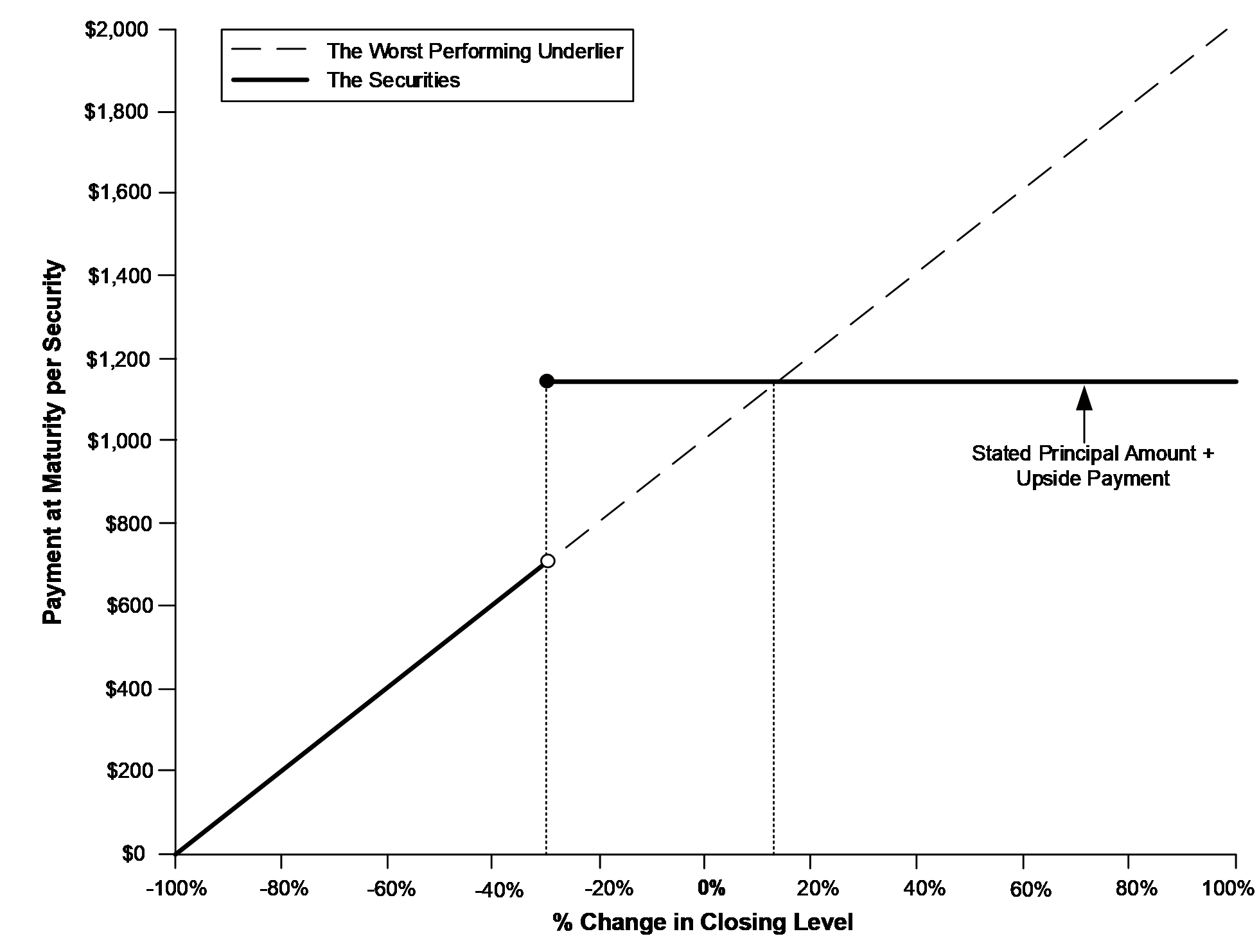 The payment at maturity will be based solely on the performance of the worst performing underlier, which could be any underlier. The payoff diagram below illustrates the payment at maturity for a range of hypothetical performances of the worst performing underlier over the term of the securities, based on the following terms: