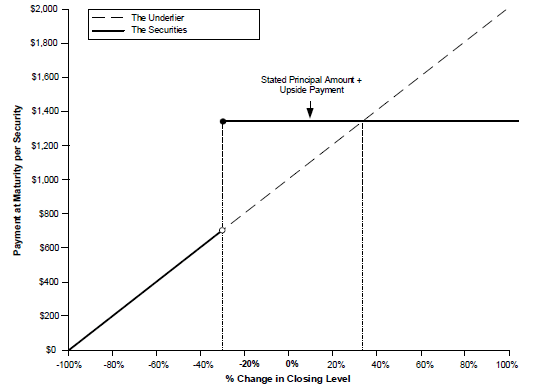 ■Payment at maturity. At maturity, if the final level is greater than or equal to the downside threshold level, investors will receive the stated principal amount plus the upside payment specified herein. If, however, the final level is less than the downside threshold level, investors will lose 1% for every 1% decline in the level of the underlier over the term of the securities. Under these circumstances, the payment at maturity will be significantly less than the stated principal amount and could be zero.