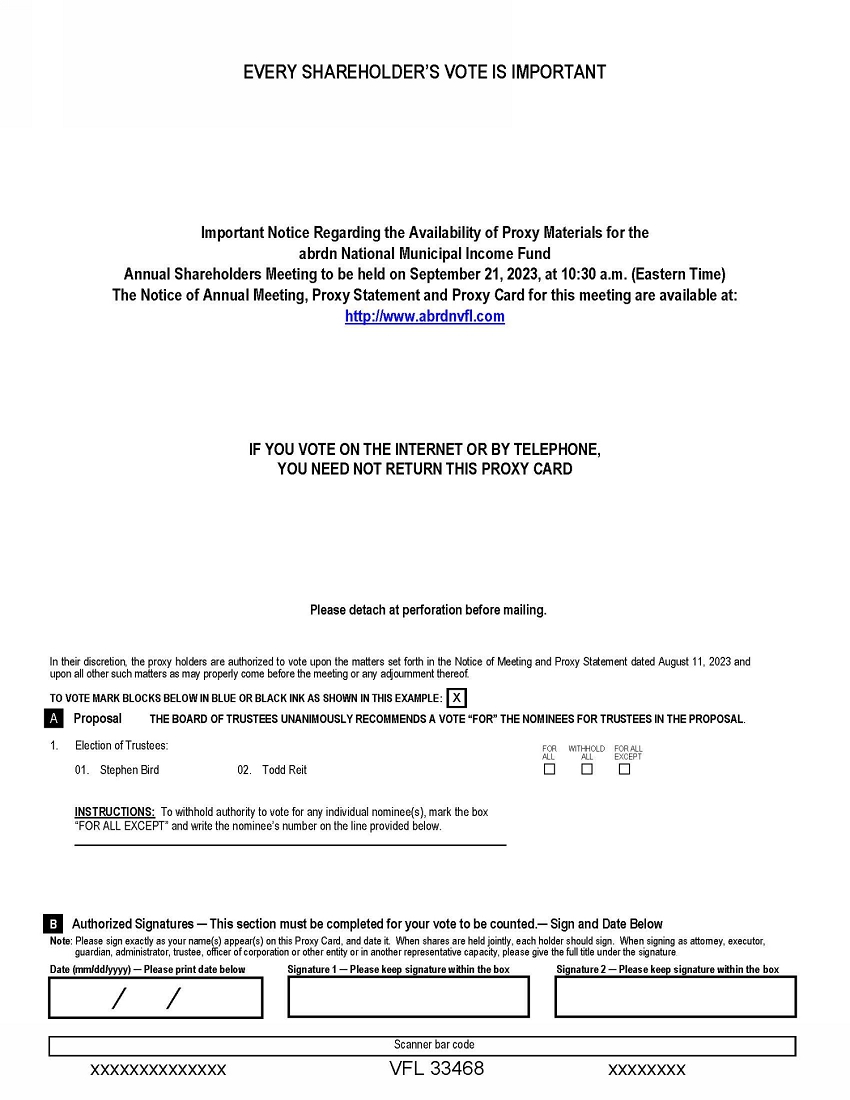 EVERY SHAREHOLDER’S VOTE IS IMPORTANTImportant Notice Regarding the Availability of Proxy Materials for the abrdn National Municipal Income Fund Annual Shareholders Meeting to be held on September 21, 2023, at 10:30 a.m. (Eastern Time) The Notice of Annual Meeting, Proxy Statement and Proxy Card for this meeting are available at: http://www.abrdnvfl.comIF YOU VOTE ON THE INTERNET OR BY TELEPHONE, YOU NEED NOT RETURN THIS PROXY CARDPlease detach at perforation before mailing.In their discretion, the proxy holders are authorized to vote upon the matters set forth in the Notice of Meeting and Proxy Statement dated August 11, 2023 and upon all other such matters as may properly come before the meeting or any adjournment thereof.TO VOTE MARK BLOCKS BELOW IN BLUE OR BLACK INK AS SHOWN IN THIS EXAMPLE: XA Proposal THE BOARD OF TRUSTEES UNANIMOUSLY RECOMMENDS A VOTE “FOR” THE NOMINEES FOR TRUSTEES IN THE PROPOSAL.1. Election of Trustees:01. Stephen Bird 02. Todd ReitINSTRUCTIONS: To withhold authority to vote for any individual nominee(s), mark the box “FOR ALL EXCEPT” and write the nominee’s number on the line provided below.B Authorized Signatures ─ This section must be completed for your vote to be counted.─ Sign and Date Below Note: Please sign exactly as your name(s) appear(s) on this Proxy Card, and date it. When shares are held jointly, each holder should sign. When signing as attorney, executor, guardian, administrator, trustee, officer of corporation or other entity or in another representative capacity, please give the full title under the signature. Date (mm/dd/yyyy) ─ Please print date below Signature 1 ─ Please keep signature within the box Signature 2 ─ Please keep signature within the boxScanner bar code xxxxxxxxxxxxxx VFL 33468 xxxxxxxx