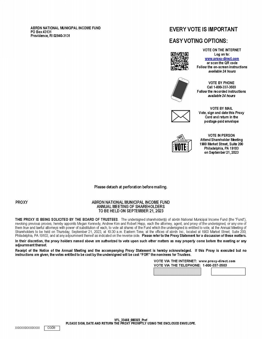 ABRDN NATIONAL MUNICIPAL INCOME FUND PO Box 43131 Providence, RI 02940-3131 EASY VOTING OPTIONS:Please detach at perforation before mailing.ABRDN NATIONAL MUNICIPAL INCOME FUND ANNUAL MEETING OF SHAREHOLDERS TO BE HELD ON SEPTEMBER 21, 2023THIS PROXY IS BEING SOLICITED BY THE BOARD OF TRUSTEES. The undersigned shareholder(s) of abrdn National Municipal Income Fund (the “Fund”), revoking previous proxies, hereby appoints Megan Kennedy, Andrew Kim and Robert Hepp, each the attorney, agent, and proxy of the undersigned, or any one of them true and lawful attorneys with power of substitution of each, to vote all shares of the Fund which the undersigned is entitled to vote, at the Annual Meeting of Shareholders to be held on Thursday, September 21, 2023, at 10:30 a.m. Eastern Time, at the offices of abrdn Inc., located at 1900 Market Street, Suite 200, Philadelphia, PA 19103, and at any adjournment thereof as indicated on the reverse side. Please refer to the Proxy Statement for a discussion of these matters.In their discretion, the proxy holders named above are authorized to vote upon such other matters as may properly come before the meeting or any adjournment thereof.Receipt of the Notice of the Annual Meeting and the accompanying Proxy Statement is hereby acknowledged. If this Proxy is executed but no instructions are given, the votes entitled to be cast by the undersigned will be cast “FOR” the nominees for Trustees.VOTE VIA THE INTERNET: www.proxy-direct.com VOTE VIA THE TELEPHONE: 1-800-337-3503VFL_33468_080323_Pref PLEASE SIGN, DATE AND RETURN THE PROXY PROMPTLY USING THE ENCLOSED ENVELOPE. xxxxxxxxxxxxxx code
