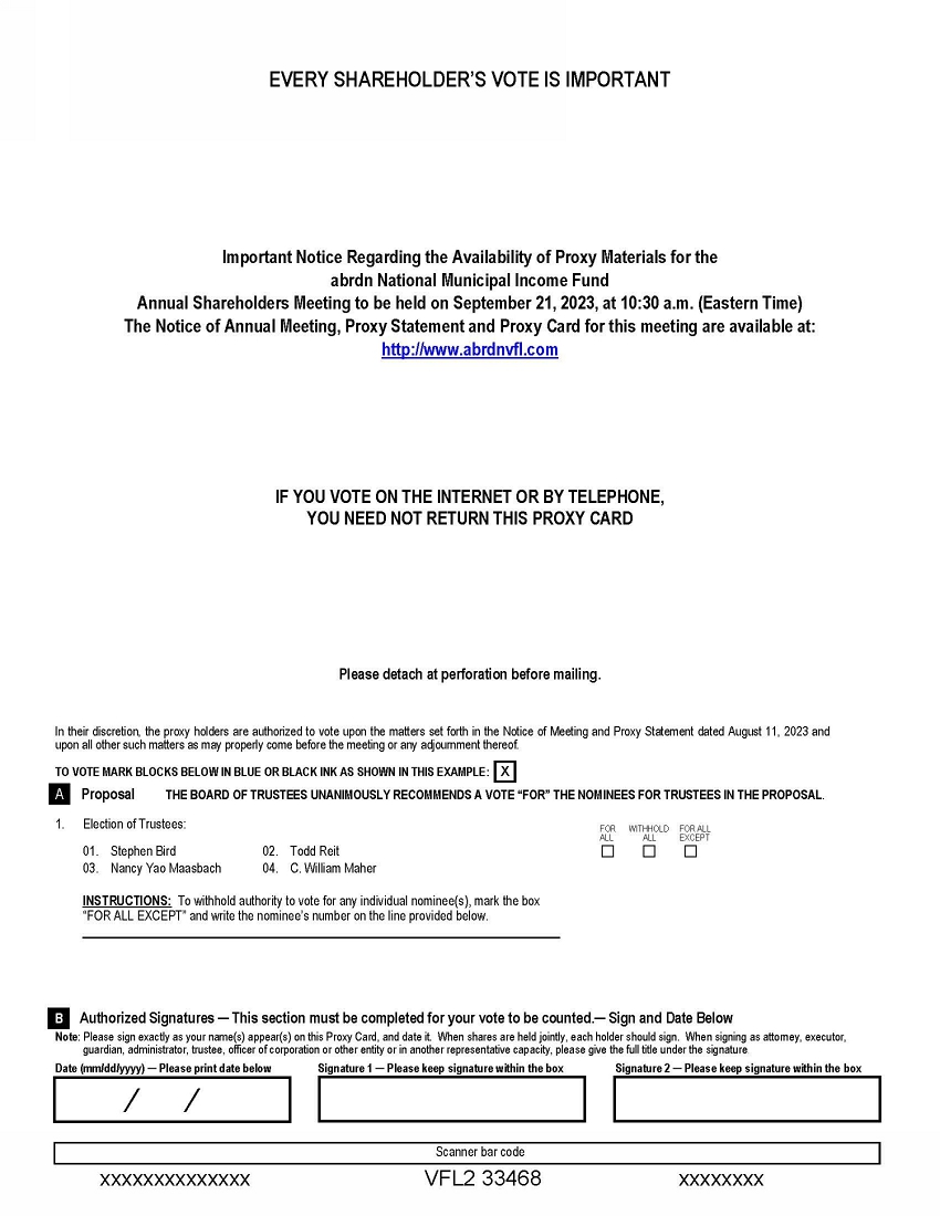 EVERY SHAREHOLDER’S VOTE IS IMPORTANTImportant Notice Regarding the Availability of Proxy Materials for the abrdn National Municipal Income Fund Annual Shareholders Meeting to be held on September 21, 2023, at 10:30 a.m. (Eastern Time) The Notice of Annual Meeting, Proxy Statement and Proxy Card for this meeting are available at: http://www.abrdnvfl.comIF YOU VOTE ON THE INTERNET OR BY TELEPHONE, YOU NEED NOT RETURN THIS PROXY CARDPlease detach at perforation before mailing.In their discretion, the proxy holders are authorized to vote upon the matters set forth in the Notice of Meeting and Proxy Statement dated August 11, 2023 and upon all other such matters as may properly come before the meeting or any adjournment thereof.TO VOTE MARK BLOCKS BELOW IN BLUE OR BLACK INK AS SHOWN IN THIS EXAMPLE: XA Proposal THE BOARD OF TRUSTEES UNANIMOUSLY RECOMMENDS A VOTE “FOR” THE NOMINEES FOR TRUSTEES IN THE PROPOSAL.1. Election of Trustees:01. Stephen Bird 02. Todd Reit 03. Nancy Yao Maasbach 04. C. William MaherINSTRUCTIONS: To withhold authority to vote for any individual nominee(s), mark the box “FOR ALL EXCEPT” and write the nominee’s number on the line provided below.B Authorized Signatures ─ This section must be completed for your vote to be counted.─ Sign and Date Below Note: Please sign exactly as your name(s) appear(s) on this Proxy Card, and date it. When shares are held jointly, each holder should sign. When signing as attorney, executor, guardian, administrator, trustee, officer of corporation or other entity or in another representative capacity, please give the full title under the signature. Date (mm/dd/yyyy) ─ Please print date below Signature 1 ─ Please keep signature within the box Signature 2 ─ Please keep signature within the boxScanner bar code xxxxxxxxxxxxxx VFL2 33468 xxxxxxxx