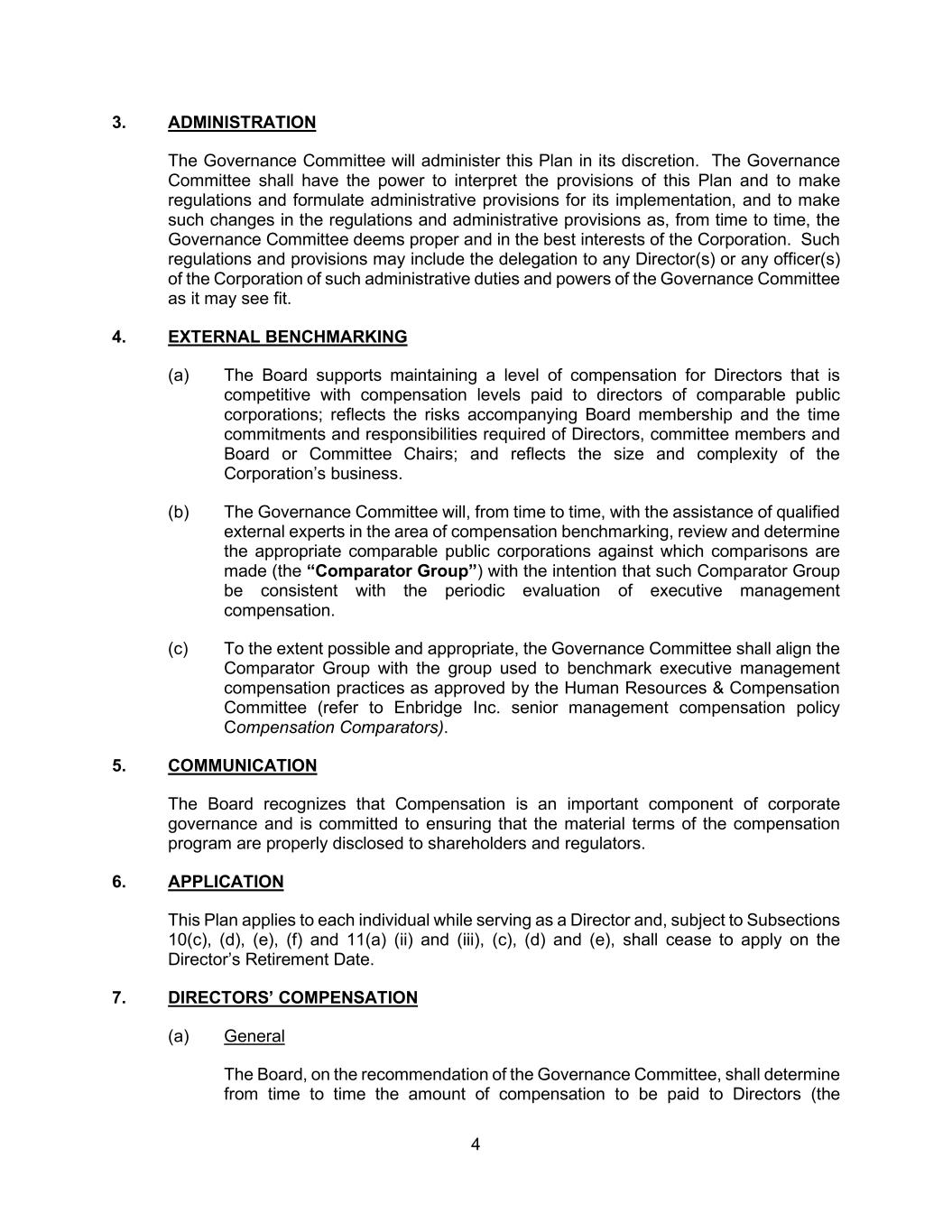 4 3. ADMINISTRATION The Governance Committee will administer this Plan in its discretion. The Governance Committee shall have the power to interpret the provisions of this Plan and to make regulations and formulate administrative provisions for its implementation, and to make such changes in the regulations and administrative provisions as, from time to time, the Governance Committee deems proper and in the best interests of the Corporation. Such regulations and provisions may include the delegation to any Director(s) or any officer(s) of the Corporation of such administrative duties and powers of the Governance Committee as it may see fit. 4. EXTERNAL BENCHMARKING (a) The Board supports maintaining a level of compensation for Directors that is competitive with compensation levels paid to directors of comparable public corporations; reflects the risks accompanying Board membership and the time commitments and responsibilities required of Directors, committee members and Board or Committee Chairs; and reflects the size and complexity of the Corporation’s business. (b) The Governance Committee will, from time to time, with the assistance of qualified external experts in the area of compensation benchmarking, review and determine the appropriate comparable public corporations against which comparisons are made (the “Comparator Group”) with the intention that such Comparator Group be consistent with the periodic evaluation of executive management compensation. (c) To the extent possible and appropriate, the Governance Committee shall align the Comparator Group with the group used to benchmark executive management compensation practices as approved by the Human Resources & Compensation Committee (refer to Enbridge Inc. senior management compensation policy Compensation Comparators). 5. COMMUNICATION The Board recognizes that Compensation is an important component of corporate governance and is committed to ensuring that the material terms of the compensation program are properly disclosed to shareholders and regulators. 6. APPLICATION This Plan applies to each individual while serving as a Director and, subject to Subsections 10(c), (d), (e), (f) and 11(a) (ii) and (iii), (c), (d) and (e), shall cease to apply on the Director’s Retirement Date. 7. DIRECTORS’ COMPENSATION (a) General The Board, on the recommendation of the Governance Committee, shall determine from time to time the amount of compensation to be paid to Directors (the