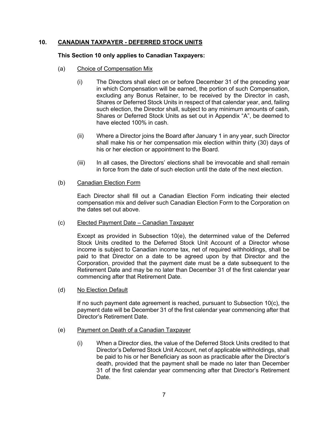 7 10. CANADIAN TAXPAYER - DEFERRED STOCK UNITS This Section 10 only applies to Canadian Taxpayers: (a) Choice of Compensation Mix (i) The Directors shall elect on or before December 31 of the preceding year in which Compensation will be earned, the portion of such Compensation, excluding any Bonus Retainer, to be received by the Director in cash, Shares or Deferred Stock Units in respect of that calendar year, and, failing such election, the Director shall, subject to any minimum amounts of cash, Shares or Deferred Stock Units as set out in Appendix “A”, be deemed to have elected 100% in cash. (ii) Where a Director joins the Board after January 1 in any year, such Director shall make his or her compensation mix election within thirty (30) days of his or her election or appointment to the Board. (iii) In all cases, the Directors’ elections shall be irrevocable and shall remain in force from the date of such election until the date of the next election. (b) Canadian Election Form Each Director shall fill out a Canadian Election Form indicating their elected compensation mix and deliver such Canadian Election Form to the Corporation on the dates set out above. (c) Elected Payment Date – Canadian Taxpayer Except as provided in Subsection 10(e), the determined value of the Deferred Stock Units credited to the Deferred Stock Unit Account of a Director whose income is subject to Canadian income tax, net of required withholdings, shall be paid to that Director on a date to be agreed upon by that Director and the Corporation, provided that the payment date must be a date subsequent to the Retirement Date and may be no later than December 31 of the first calendar year commencing after that Retirement Date. (d) No Election Default If no such payment date agreement is reached, pursuant to Subsection 10(c), the payment date will be December 31 of the first calendar year commencing after that Director’s Retirement Date. (e) Payment on Death of a Canadian Taxpayer (i) When a Director dies, the value of the Deferred Stock Units credited to that Director’s Deferred Stock Unit Account, net of applicable withholdings, shall be paid to his or her Beneficiary as soon as practicable after the Director’s death, provided that the payment shall be made no later than December 31 of the first calendar year commencing after that Director’s Retirement Date.