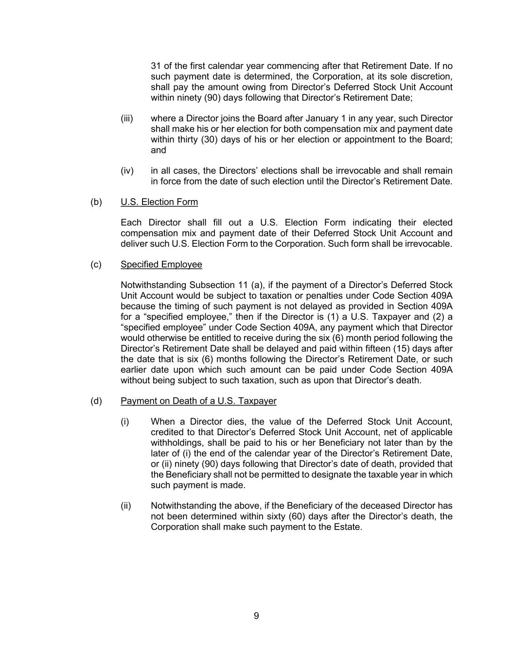 9 31 of the first calendar year commencing after that Retirement Date. If no such payment date is determined, the Corporation, at its sole discretion, shall pay the amount owing from Director’s Deferred Stock Unit Account within ninety (90) days following that Director’s Retirement Date; (iii) where a Director joins the Board after January 1 in any year, such Director shall make his or her election for both compensation mix and payment date within thirty (30) days of his or her election or appointment to the Board; and (iv) in all cases, the Directors’ elections shall be irrevocable and shall remain in force from the date of such election until the Director’s Retirement Date. (b) U.S. Election Form Each Director shall fill out a U.S. Election Form indicating their elected compensation mix and payment date of their Deferred Stock Unit Account and deliver such U.S. Election Form to the Corporation. Such form shall be irrevocable. (c) Specified Employee Notwithstanding Subsection 11 (a), if the payment of a Director’s Deferred Stock Unit Account would be subject to taxation or penalties under Code Section 409A because the timing of such payment is not delayed as provided in Section 409A for a “specified employee,” then if the Director is (1) a U.S. Taxpayer and (2) a “specified employee” under Code Section 409A, any payment which that Director would otherwise be entitled to receive during the six (6) month period following the Director’s Retirement Date shall be delayed and paid within fifteen (15) days after the date that is six (6) months following the Director’s Retirement Date, or such earlier date upon which such amount can be paid under Code Section 409A without being subject to such taxation, such as upon that Director’s death. (d) Payment on Death of a U.S. Taxpayer (i) When a Director dies, the value of the Deferred Stock Unit Account, credited to that Director’s Deferred Stock Unit Account, net of applicable withholdings, shall be paid to his or her Beneficiary not later than by the later of (i) the end of the calendar year of the Director’s Retirement Date, or (ii) ninety (90) days following that Director’s date of death, provided that the Beneficiary shall not be permitted to designate the taxable year in which such payment is made. (ii) Notwithstanding the above, if the Beneficiary of the deceased Director has not been determined within sixty (60) days after the Director’s death, the Corporation shall make such payment to the Estate.