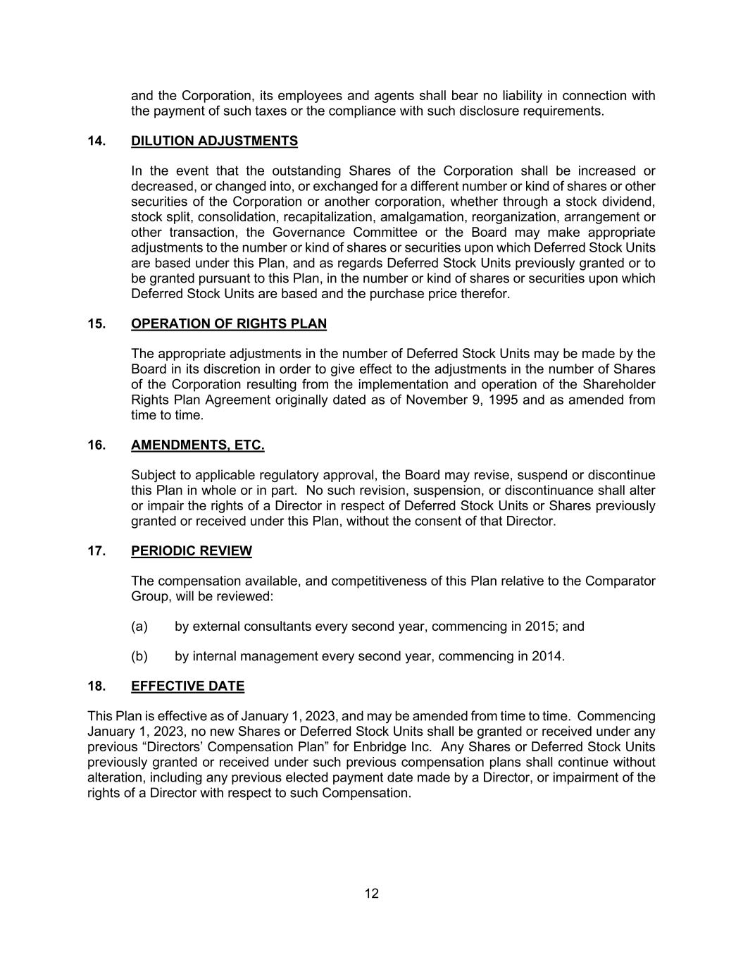 12 and the Corporation, its employees and agents shall bear no liability in connection with the payment of such taxes or the compliance with such disclosure requirements. 14. DILUTION ADJUSTMENTS In the event that the outstanding Shares of the Corporation shall be increased or decreased, or changed into, or exchanged for a different number or kind of shares or other securities of the Corporation or another corporation, whether through a stock dividend, stock split, consolidation, recapitalization, amalgamation, reorganization, arrangement or other transaction, the Governance Committee or the Board may make appropriate adjustments to the number or kind of shares or securities upon which Deferred Stock Units are based under this Plan, and as regards Deferred Stock Units previously granted or to be granted pursuant to this Plan, in the number or kind of shares or securities upon which Deferred Stock Units are based and the purchase price therefor. 15. OPERATION OF RIGHTS PLAN The appropriate adjustments in the number of Deferred Stock Units may be made by the Board in its discretion in order to give effect to the adjustments in the number of Shares of the Corporation resulting from the implementation and operation of the Shareholder Rights Plan Agreement originally dated as of November 9, 1995 and as amended from time to time. 16. AMENDMENTS, ETC. Subject to applicable regulatory approval, the Board may revise, suspend or discontinue this Plan in whole or in part. No such revision, suspension, or discontinuance shall alter or impair the rights of a Director in respect of Deferred Stock Units or Shares previously granted or received under this Plan, without the consent of that Director. 17. PERIODIC REVIEW The compensation available, and competitiveness of this Plan relative to the Comparator Group, will be reviewed: (a) by external consultants every second year, commencing in 2015; and (b) by internal management every second year, commencing in 2014. 18. EFFECTIVE DATE This Plan is effective as of January 1, 2023, and may be amended from time to time. Commencing January 1, 2023, no new Shares or Deferred Stock Units shall be granted or received under any previous “Directors’ Compensation Plan” for Enbridge Inc. Any Shares or Deferred Stock Units previously granted or received under such previous compensation plans shall continue without alteration, including any previous elected payment date made by a Director, or impairment of the rights of a Director with respect to such Compensation.
