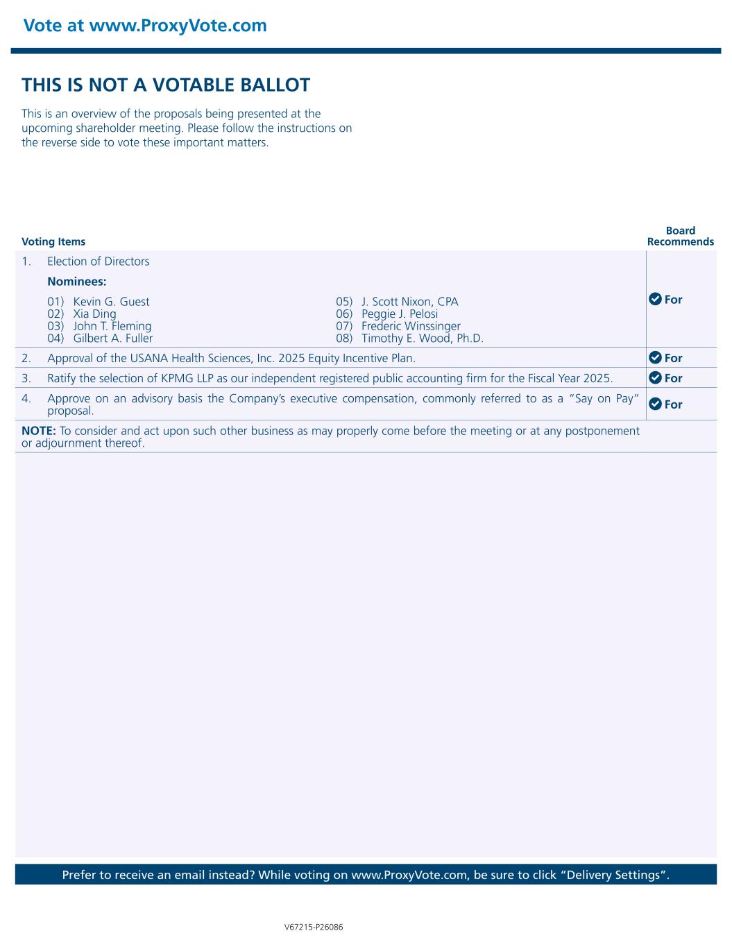 Vote at www.ProxyVote.com Prefer to receive an email instead? While voting on www.ProxyVote.com, be sure to click “Delivery Settings”. Voting Items Board Recommends V67215-P26086 THIS IS NOT A VOTABLE BALLOT This is an overview of the proposals being presented at the upcoming shareholder meeting. Please follow the instructions on the reverse side to vote these important matters. 1. Election of Directors For Nominees: 01) Kevin G. Guest 02) Xia Ding 03) John T. Fleming 04) Gilbert A. Fuller 05) J. Scott Nixon, CPA 06) Peggie J. Pelosi 07) Frederic Winssinger 08) Timothy E. Wood, Ph.D. 2. Approval of the USANA Health Sciences, Inc. 2025 Equity Incentive Plan. For 3. Ratify the selection of KPMG LLP as our independent registered public accounting firm for the Fiscal Year 2025. For 4. Approve on an advisory basis the Company’s executive compensation, commonly referred to as a “Say on Pay” proposal. For NOTE: To consider and act upon such other business as may properly come before the meeting or at any postponement or adjournment thereof.