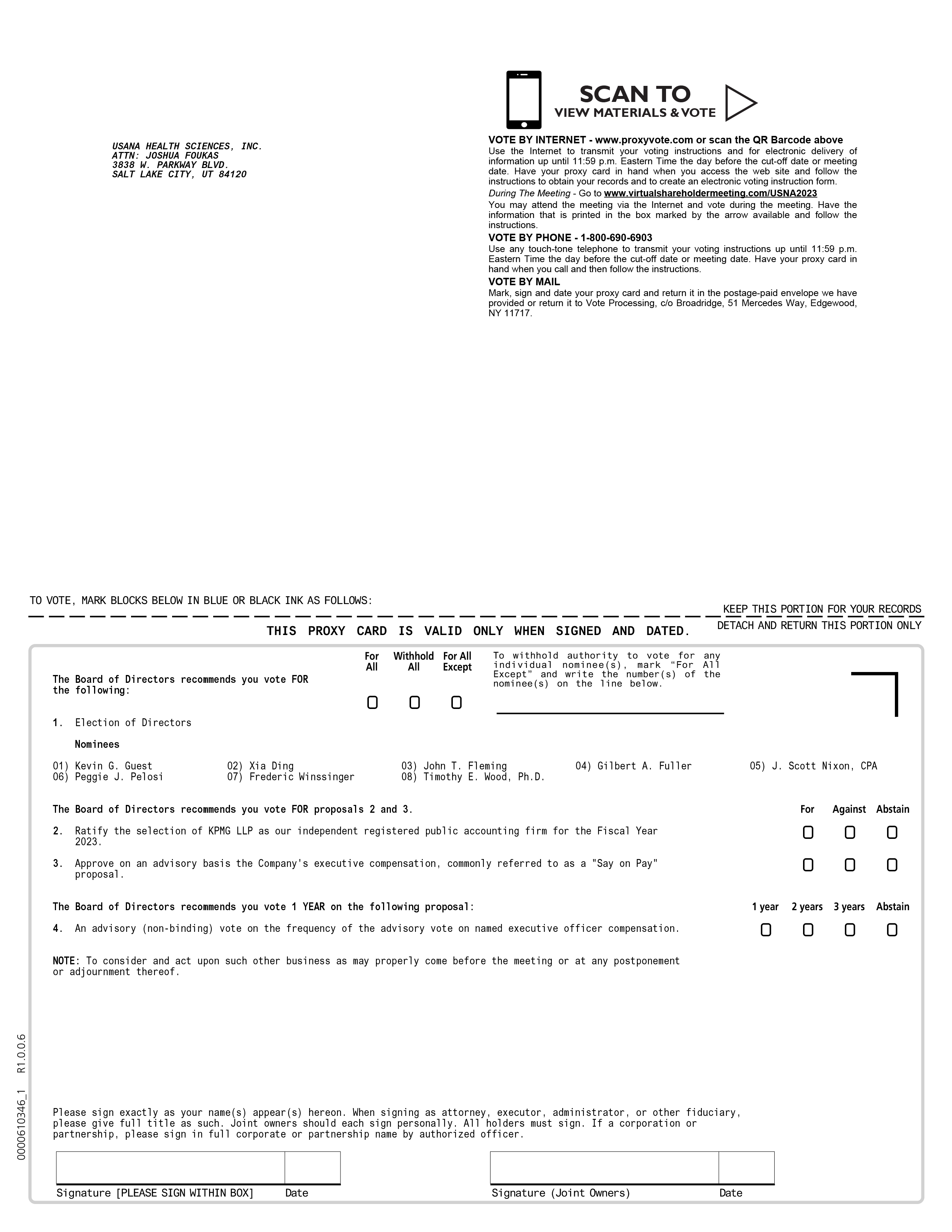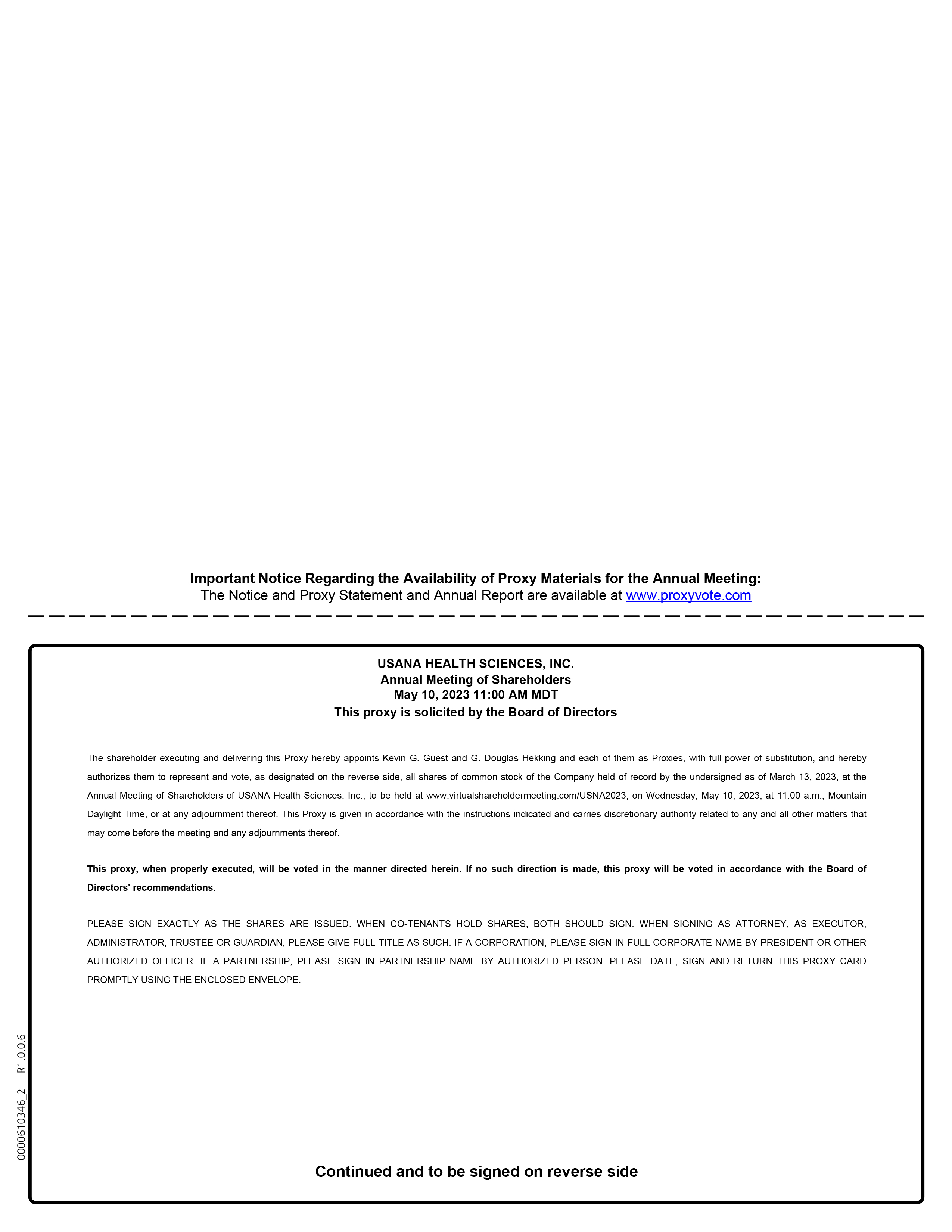You are invited to participate in the Annual Meeting of Shareholders of USANA Health Sciences, Inc. on Wednesday, May 10, 2023, at 11:00 a.m., Mountain Daylight Time. We will conduct the Annual Meeting via a live webcast. There will not be an