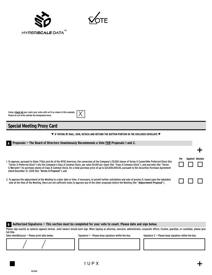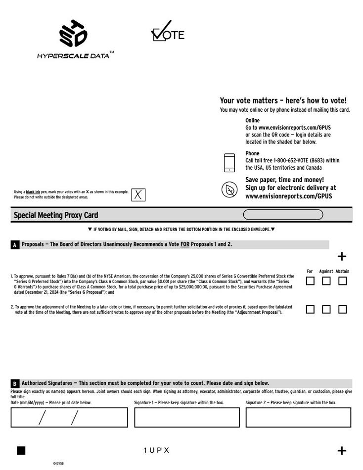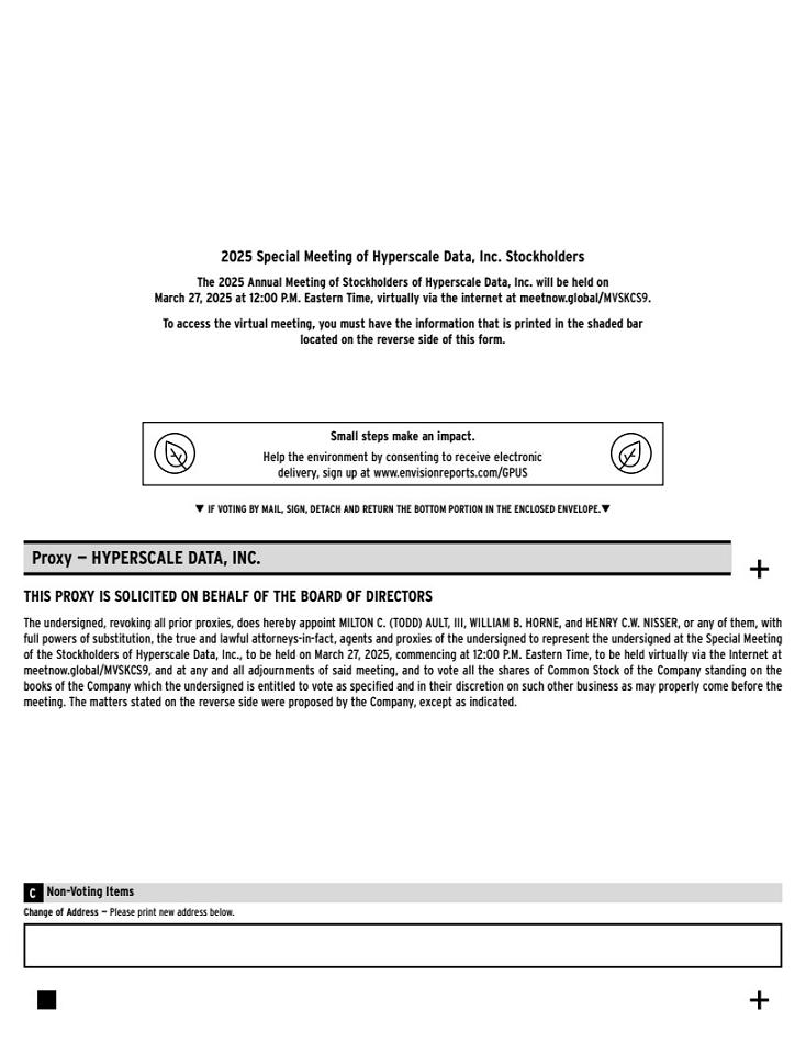 Small steps make an impact.Help the environment by consenting to receive electronic delivery, sign up at www.envisionreports.com/GPUSTHIS PROXY IS SOLICITED ON BEHALF OF THE BOARD OF DIRECTORSThe undersigned, revoking all prior proxies, does hereby appoint MILTON C. (TODD) AULT, III, WILLIAM B. HORNE, and HENRY C.W. NISSER, or any of them, with full powers of substitution, the true and lawful attorneys-in-fact, agents and proxies of the undersigned to represent the undersigned at the Special Meeting of the Stockholders of Hyperscale Data, Inc., to be held on March 27, 2025, commencing at 12:00 P.M. Eastern Time, to be held virtually via the Internet at meetnow.global/MVSKCS9, and at any and all adjournments of said meeting, and to vote all the shares of Common Stock of the Company standing on the books of the Company which the undersigned is entitled to vote as specified and in their discretion on such other business as may properly come before the meeting. The matters stated on the reverse side were proposed by the Company, except as indicated.Proxy ? HYPERSCALE DATA, INC.Non-Voting ItemsCqIF VOTING BY MAIL, SIGN, DETACH AND RETURN THE BOTTOM PORTION IN THE ENCLOSED ENVELOPE.qChange of Address ? Please print new address below.2025 Special Meeting of Hyperscale Data, Inc. StockholdersThe 2025 Annual Meeting of Stockholders of Hyperscale Data, Inc. will be held on March 27, 2025 at 12:00 P.M. Eastern Time, virtually via the internet at meetnow.global/MVSKCS9.To access the virtual meeting, you must have the information that is printed in the shaded bar located on the reverse side of this form.