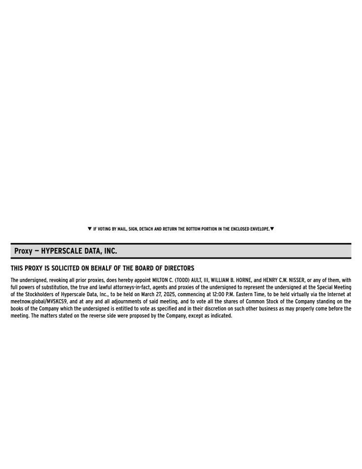 THIS PROXY IS SOLICITED ON BEHALF OF THE BOARD OF DIRECTORSThe undersigned, revoking all prior proxies, does hereby appoint MILTON C. (TODD) AULT, III, WILLIAM B. HORNE, and HENRY C.W. NISSER, or any of them, with full powers of substitution, the true and lawful attorneys-in-fact, agents and proxies of the undersigned to represent the undersigned at the Special Meeting of the Stockholders of Hyperscale Data, Inc., to be held on March 27, 2025, commencing at 12:00 P.M. Eastern Time, to be held virtually via the Internet at meetnow.global/MVSKCS9, and at any and all adjournments of said meeting, and to vote all the shares of Common Stock of the Company standing on the books of the Company which the undersigned is entitled to vote as specified and in their discretion on such other business as may properly come before the meeting. The matters stated on the reverse side were proposed by the Company, except as indicated.Proxy ? HYPERSCALE DATA, INC.qIF VOTING BY MAIL, SIGN, DETACH AND RETURN THE BOTTOM PORTION IN THE ENCLOSED ENVELOPE.q