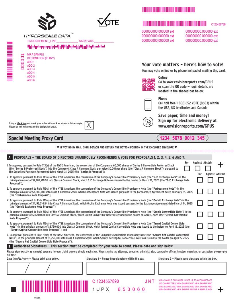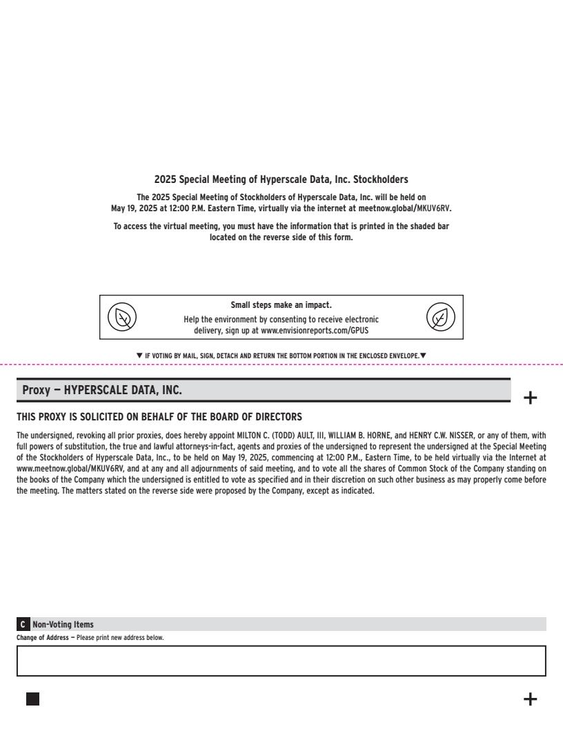 Small steps make an impact.Help the environment by consenting to receive electronic delivery, sign up at www.envisionreports.com/GPUSTHIS PROXY IS SOLICITED ON BEHALF OF THE BOARD OF DIRECTORSThe undersigned, revoking all prior proxies, does hereby appoint MILTON C. (TODD) AULT, III, WILLIAM B. HORNE, and HENRY C.W. NISSER, or any of them, with full powers of substitution, the true and lawful attorneys-in-fact, agents and proxies of the undersigned to represent the undersigned at the Special Meeting of the Stockholders of Hyperscale Data, Inc., to be held on May 19, 2025, commencing at 12:00 P.M., Eastern Time, to be held virtually via the Internet at www.meetnow.global/MKUV6RV, and at any and all adjournments of said meeting, and to vote all the shares of Common Stock of the Company standing on the books of the Company which the undersigned is entitled to vote as specified and in their discretion on such other business as may properly come before the meeting. The matters stated on the reverse side were proposed by the Company, except as indicated.Proxy ? HYPERSCALE DATA, INC.Non-Voting ItemsCq IF VOTING BY MAIL, SIGN, DETACH AND RETURN THE BOTTOM PORTION IN THE ENCLOSED ENVELOPE.qChange of Address ? Please print new address below.2025 Special Meeting of Hyperscale Data, Inc. StockholdersThe 2025 Special Meeting of Stockholders of Hyperscale Data, Inc. will be held on May 19, 2025 at 12:00 P.M. Eastern Time, virtually via the internet at meetnow.global/MKUV6RV.To access the virtual meeting, you must have the information that is printed in the shaded bar located on the reverse side of this form.