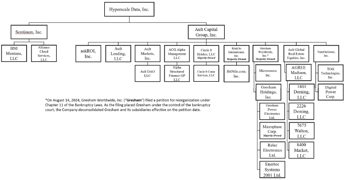 Hyperscale Data, Inc., a Delaware corporation formerly known as Ault Alliance, Inc., was incorporated in September 2017. Through our wholly and majority owned subsidiaries and strategic investments, we own and/or operate data centers at which we mine Bitcoin and offer colocation and hosting services for the emerging artificial intelligence (“AI”) ecosystems and other industries as well as provide mission-critical products that support a diverse range of industries, including an artificial intelligence software platform, a social gaming platform, equipment rental services, defense/aerospace, industrial, automotive, medical/biopharma and hotel operations. Our direct and indirect wholly owned subsidiaries include (i) Sentinum, Inc. (“Sentinum”), (ii) Alliance Cloud Services, LLC (“ACS”) and (iii) BNI Montana, LLC (“BNI Montana”).