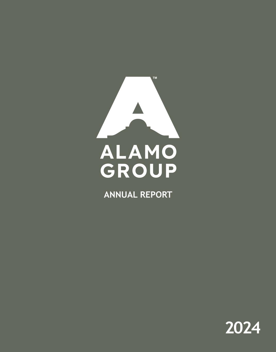 UNITED STATES SECURITIES AND EXCHANGE COMMISSION WASHINGTON, D.C. 20549 Form 10-K ☒ ANNUAL REPORT PURSUANT TO SECTION 13 OR 15(d)  OF THE SECURITIES EXCHANGE ACT OF 1934 FOR THE YEAR ENDED DECEMBER 31, 2024 ☐ TRANSITION REPORT PURSUANT TO SECTION 13 OR 15(d)  OF THE SECURITIES EXCHANGE ACT OF 1934 Commission file number 0-21220 ALAMO GROUP INC. (Exact name of registrant as specified in its charter) Delaware 74-1621248 (State or other jurisdiction of (I.R.S. Employer incorporation or organization) Identification Number)  1627 East Walnut, Seguin, Texas 78155 (Address of principal executive offices, including zip code)   830-379-1480 (Registrant’s telephone number, including area code) Securities registered pursuant to Section 12(b) of the Act: Title of each class Trading symbol(s) Name of each exchange Common Stock, par value $.10 per share ALG on which registered New York Stock Exchange  SECURITIES REGISTERED PURSUANT TO SECTION 12(g) OF THE ACT:  None   Indicate by check mark if the registrant is a well-known seasoned issuer, as defined in Rule 405 of the Securities Act. Yes ☒ No ☐ Indicate by check mark if the registrant is not required to file reports pursuant to Section 13 or Section 15(d) of the Exchange Act. Yes ☐ No ☒ Indicate by check mark whether the registrant (1) has filed all reports required to be filed by Section 13 or 15(d) of the Securities Exchange  Act of 1934 during the preceding 12 months (or for such shorter period that the registrant was required to file such reports), and (2) has been  subject to such filing requirement for the past 90 days. Yes ☒  No ☐ Indicate by check mark whether the registrant has submitted electronically every Interactive Data File required to be submitted pursuant to  Rule 405 of Regulation S-T during the preceding 12 months (or for such shorter period that the registrant was required to submit such files). Yes ☒  No ☐ Indicate by check mark whether registrant is a large accelerated filer, an accelerated filer, a non-accelerated filer, a smaller reporting  company or an emerging growth company. See definitions of “large accelerated filer,” “accelerated filer,” “smaller reporting company,” and an  "emerging growth company" in Rule 12b-2 of the Exchange Act. Large accelerated filer ☒ Accelerated filer                        ☐ Non-accelerated filer     ☐ Smaller reporting company        ☐ Emerging growth company ☐ If an emerging growth company, indicate by check mark if the registrant has elected not to use the extended transition period for complying  with any new or revised financial accounting standards provided pursuant to Section 13(a) of the Exchange Act. ☐ Indicate by check mark whether the registrant has filed a report on and attestation to its management's assessment of the effectiveness of its  internal control over financial reporting under Section 404(b) of the Sarbanes-Oxley Act (15 U.S.C. 7262(b)) by the registered public accounting  firm that prepared or issued its audit report. ☒ If securities are registered pursuant to Section 12(b) of the Act, indicate by check mark whether the financial statements the registrant  included in the filing reflect the correction of an error to previously issued financial statements. ☐ Indicate by check mark whether any of those error corrections are restatements that required a recovery analysis of incentive-based  compensation received by any of the registrant's executive officers during the relevant recovery period pursuant §240.10D-1(b). ☐ Indicate by check mark whether the registrant is a shell company (as defined in Rule 12b-2 of the Exchange Act). Yes ☐ No ☒   The aggregate market value of the voting stock (which consists solely of shares of common stock) held by non-affiliates of the registrant as of  June 30, 2024 (based upon the last reported sale price of $173.00 per share) was approximately $1,770,634,586 on such date.