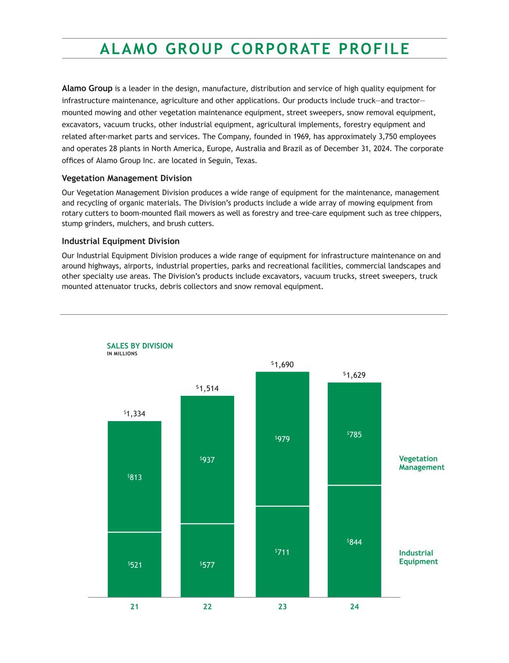 ALAMO GROUP CORPORATE PROFILE Alamo Group is a leader in the design, manufacture, distribution and service of high quality equipment for  infrastructure maintenance, agriculture and other applications. Our products include truck—and tractor— mounted mowing and other vegetation maintenance equipment, street sweepers, snow removal equipment,  excavators, vacuum trucks, other industrial equipment, agricultural implements, forestry equipment and  related after-market parts and services. The Company, founded in 1969, has approximately 3,750 employees  and operates 28 plants in North America, Europe, Australia and Brazil as of December 31, 2024. The corporate  offices of Alamo Group Inc. are located in Seguin, Texas. Vegetation Management Division Our Vegetation Management Division produces a wide range of equipment for the maintenance, management  and recycling of organic materials. The Division’s products include a wide array of mowing equipment from  rotary cutters to boom-mounted flail mowers as well as forestry and tree-care equipment such as tree chippers,  stump grinders, mulchers, and brush cutters. Industrial Equipment Division Our Industrial Equipment Division produces a wide range of equipment for infrastructure maintenance on and  around highways, airports, industrial properties, parks and recreational facilities, commercial landscapes and  other specialty use areas. The Division’s products include excavators, vacuum trucks, street sweepers, truck  mounted attenuator trucks, debris collectors and snow removal equipment. SALES BY DIVISION  IN MILLIONS Vegetation  Management Industrial Equipment $1,334 $1,514 $1,690 2221 $521 $813 $937 $577 $979 $711 23 $1,629 $785 $844 24