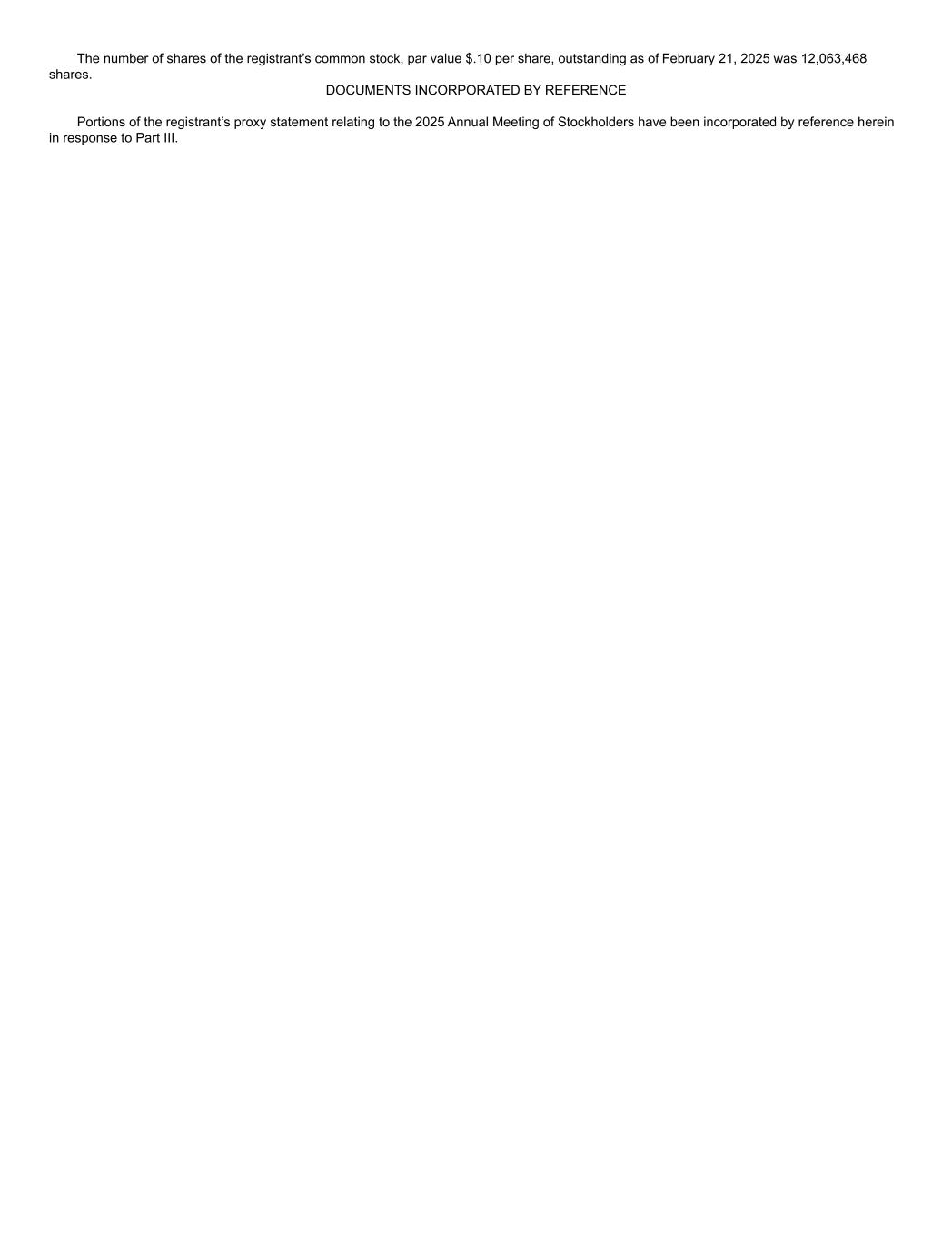 The number of shares of the registrant’s common stock, par value $.10 per share, outstanding as of February 21, 2025 was 12,063,468  shares. DOCUMENTS INCORPORATED BY REFERENCE Portions of the registrant’s proxy statement relating to the 2025 Annual Meeting of Stockholders have been incorporated by reference herein  in response to Part III.