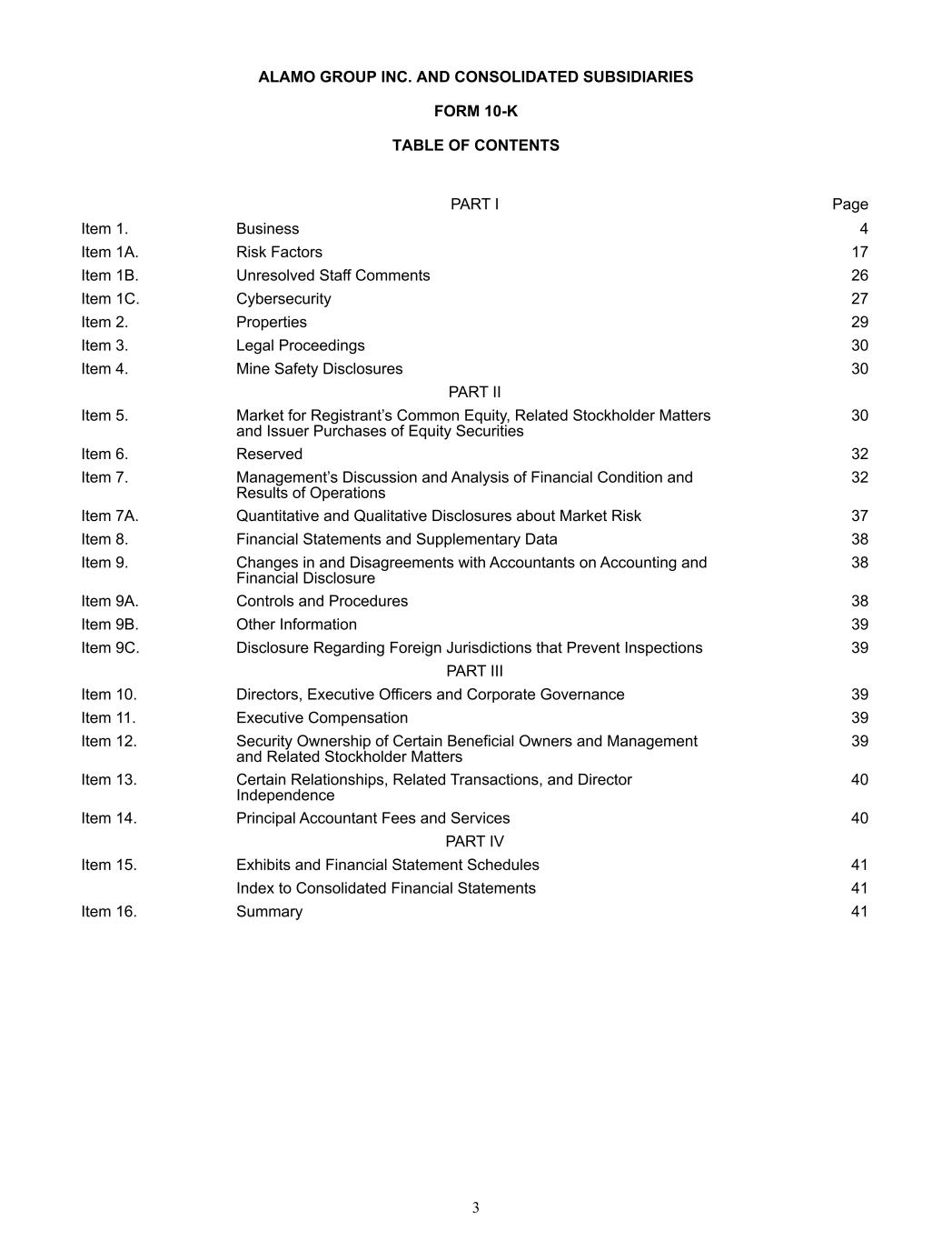 ALAMO GROUP INC. AND CONSOLIDATED SUBSIDIARIES FORM 10-K TABLE OF CONTENTS                                                                                                                                                    PART I Page Item 1. Business 4 Item 1A. Risk Factors 17 Item 1B. Unresolved Staff Comments 26 Item 1C. Cybersecurity 27 Item 2. Properties 29 Item 3. Legal Proceedings 30 Item 4. Mine Safety Disclosures 30  PART II   Item 5. Market for Registrant’s Common Equity, Related Stockholder Matters  and Issuer Purchases of Equity Securities 30 Item 6. Reserved 32 Item 7. Management’s Discussion and Analysis of Financial Condition and  Results of Operations 32 Item 7A. Quantitative and Qualitative Disclosures about Market Risk 37 Item 8. Financial Statements and Supplementary Data 38 Item 9. Changes in and Disagreements with Accountants on Accounting and  Financial Disclosure 38 Item 9A. Controls and Procedures 38 Item 9B. Other Information 39 Item 9C. Disclosure Regarding Foreign Jurisdictions that Prevent Inspections 39  PART III   Item 10. Directors, Executive Officers and Corporate Governance 39 Item 11. Executive Compensation 39 Item 12. Security Ownership of Certain Beneficial Owners and Management  and Related Stockholder Matters 39 Item 13. Certain Relationships, Related Transactions, and Director  Independence 40 Item 14. Principal Accountant Fees and Services 40  PART IV   Item 15. Exhibits and Financial Statement Schedules 41  Index to Consolidated Financial Statements 41 Item 16. Summary 41   3