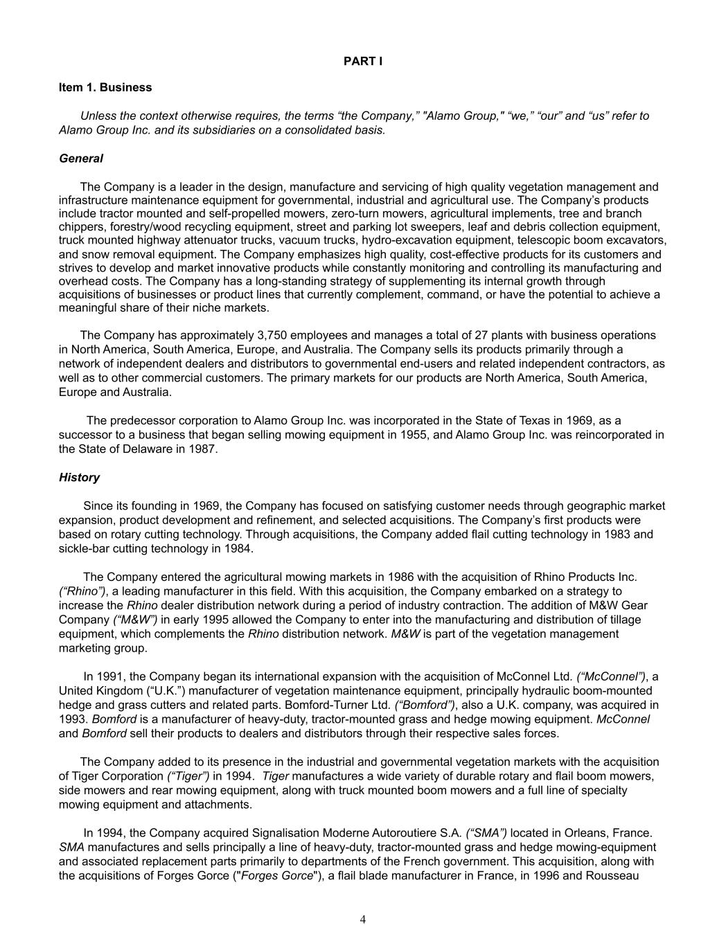 PART I Item 1. Business  Unless the context otherwise requires, the terms “the Company,” "Alamo Group," “we,” “our” and “us” refer to  Alamo Group Inc. and its subsidiaries on a consolidated basis.   General   The Company is a leader in the design, manufacture and servicing of high quality vegetation management and  infrastructure maintenance equipment for governmental, industrial and agricultural use. The Company’s products  include tractor mounted and self-propelled mowers, zero-turn mowers, agricultural implements, tree and branch  chippers, forestry/wood recycling equipment, street and parking lot sweepers, leaf and debris collection equipment,  truck mounted highway attenuator trucks, vacuum trucks, hydro-excavation equipment, telescopic boom excavators,  and snow removal equipment.	The Company emphasizes high quality, cost-effective products for its customers and  strives to develop and market innovative products while constantly monitoring and controlling its manufacturing and  overhead costs. The Company has a long-standing strategy of supplementing its internal growth through  acquisitions of businesses or product lines that currently complement, command, or have the potential to achieve a  meaningful share of their niche markets.  The Company has approximately 3,750 employees and manages a total of 27 plants with business operations  in North America, South America, Europe, and Australia. The Company sells its products primarily through a  network of independent dealers and distributors to governmental end-users and related independent contractors, as  well as to other commercial customers. The primary markets for our products are North America, South America,  Europe and Australia.      The predecessor corporation to Alamo Group Inc. was incorporated in the State of Texas in 1969, as a  successor to a business that began selling mowing equipment in 1955, and Alamo Group Inc. was reincorporated in  the State of Delaware in 1987. History  Since its founding in 1969, the Company has focused on satisfying customer needs through geographic market  expansion, product development and refinement, and selected acquisitions. The Company’s first products were  based on rotary cutting technology. Through acquisitions, the Company added flail cutting technology in 1983 and  sickle-bar cutting technology in 1984.   The Company entered the agricultural mowing markets in 1986 with the acquisition of Rhino Products Inc.  (“Rhino”), a leading manufacturer in this field. With this acquisition, the Company embarked on a strategy to  increase the Rhino dealer distribution network during a period of industry contraction. The addition of M&W Gear  Company (“M&W”) in early 1995 allowed the Company to enter into the manufacturing and distribution of tillage  equipment, which complements the Rhino distribution network. M&W is part of the vegetation management  marketing group.   In 1991, the Company began its international expansion with the acquisition of McConnel Ltd. (“McConnel”), a  United Kingdom (“U.K.”) manufacturer of vegetation maintenance equipment, principally hydraulic boom-mounted  hedge and grass cutters and related parts. Bomford-Turner Ltd. (“Bomford”), also a U.K. company, was acquired in  1993. Bomford is a manufacturer of heavy-duty, tractor-mounted grass and hedge mowing equipment. McConnel  and Bomford sell their products to dealers and distributors through their respective sales forces. The Company added to its presence in the industrial and governmental vegetation markets with the acquisition  of Tiger Corporation (“Tiger”) in 1994.  Tiger manufactures a wide variety of durable rotary and flail boom mowers,  side mowers and rear mowing equipment, along with truck mounted boom mowers and a full line of specialty  mowing equipment and attachments.  In 1994, the Company acquired Signalisation Moderne Autoroutiere S.A. (“SMA”) located in Orleans, France.  SMA manufactures and sells principally a line of heavy-duty, tractor-mounted grass and hedge mowing-equipment  and associated replacement parts primarily to departments of the French government. This acquisition, along with  the acquisitions of Forges Gorce ("Forges Gorce"), a flail blade manufacturer in France, in 1996 and Rousseau  4