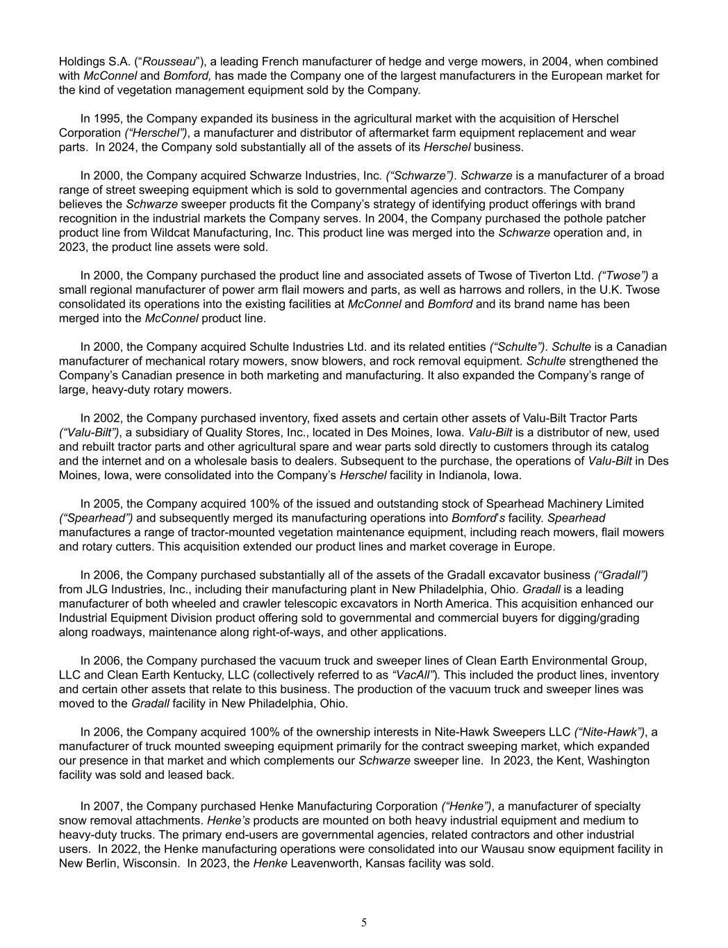 Holdings S.A. (“Rousseau”), a leading French manufacturer of hedge and verge mowers, in 2004, when combined  with McConnel and Bomford, has made the Company one of the largest manufacturers in the European market for  the kind of vegetation management equipment sold by the Company. In 1995, the Company expanded its business in the agricultural market with the acquisition of Herschel  Corporation (“Herschel”), a manufacturer and distributor of aftermarket farm equipment replacement and wear  parts.  In 2024, the Company sold substantially all of the assets of its Herschel business. In 2000, the Company acquired Schwarze Industries, Inc. (“Schwarze”). Schwarze is a manufacturer of a broad  range of street sweeping equipment which is sold to governmental agencies and contractors. The Company  believes the Schwarze sweeper products fit the Company’s strategy of identifying product offerings with brand  recognition in the industrial markets the Company serves. In 2004, the Company purchased the pothole patcher  product line from Wildcat Manufacturing, Inc. This product line was merged into the Schwarze operation and, in  2023, the product line assets were sold. In 2000, the Company purchased the product line and associated assets of Twose of Tiverton Ltd. (“Twose”) a  small regional manufacturer of power arm flail mowers and parts, as well as harrows and rollers, in the U.K. Twose  consolidated its operations into the existing facilities at McConnel and Bomford and its brand name has been  merged into the McConnel product line.  In 2000, the Company acquired Schulte Industries Ltd. and its related entities (“Schulte”). Schulte is a Canadian  manufacturer of mechanical rotary mowers, snow blowers, and rock removal equipment. Schulte strengthened the  Company’s Canadian presence in both marketing and manufacturing. It also expanded the Company’s range of  large, heavy-duty rotary mowers. In 2002, the Company purchased inventory, fixed assets and certain other assets of Valu-Bilt Tractor Parts  (“Valu-Bilt”), a subsidiary of Quality Stores, Inc., located in Des Moines, Iowa. Valu-Bilt is a distributor of new, used  and rebuilt tractor parts and other agricultural spare and wear parts sold directly to customers through its catalog  and the internet and on a wholesale basis to dealers. Subsequent to the purchase, the operations of Valu-Bilt in Des  Moines, Iowa, were consolidated into the Company’s Herschel facility in Indianola, Iowa. In 2005, the Company acquired 100% of the issued and outstanding stock of Spearhead Machinery Limited  (“Spearhead”) and subsequently merged its manufacturing operations into Bomford’s facility. Spearhead  manufactures a range of tractor-mounted vegetation maintenance equipment, including reach mowers, flail mowers  and rotary cutters. This acquisition extended our product lines and market coverage in Europe. In 2006, the Company purchased substantially all of the assets of the Gradall excavator business (“Gradall”)  from JLG Industries, Inc., including their manufacturing plant in New Philadelphia, Ohio. Gradall is a leading  manufacturer of both wheeled and crawler telescopic excavators in North America. This acquisition enhanced our  Industrial Equipment Division product offering sold to governmental and commercial buyers for digging/grading  along roadways, maintenance along right-of-ways, and other applications. In 2006, the Company purchased the vacuum truck and sweeper lines of Clean Earth Environmental Group,  LLC and Clean Earth Kentucky, LLC (collectively referred to as “VacAll”). This included the product lines, inventory  and certain other assets that relate to this business. The production of the vacuum truck and sweeper lines was  moved to the Gradall facility in New Philadelphia, Ohio. In 2006, the Company acquired 100% of the ownership interests in Nite-Hawk Sweepers LLC (“Nite-Hawk”), a  manufacturer of truck mounted sweeping equipment primarily for the contract sweeping market, which expanded  our presence in that market and which complements our Schwarze sweeper line.  In 2023, the Kent, Washington  facility was sold and leased back.   In 2007, the Company purchased Henke Manufacturing Corporation (“Henke”), a manufacturer of specialty  snow removal attachments. Henke’s products are mounted on both heavy industrial equipment and medium to  heavy-duty trucks. The primary end-users are governmental agencies, related contractors and other industrial  users.  In 2022, the Henke manufacturing operations were consolidated into our Wausau snow equipment facility in  New Berlin, Wisconsin.  In 2023, the Henke Leavenworth, Kansas facility was sold. 5
