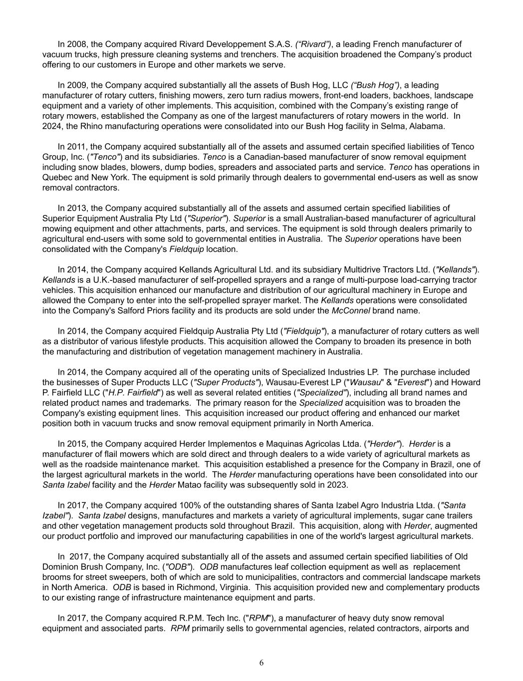 In 2008, the Company acquired Rivard Developpement S.A.S. (“Rivard”), a leading French manufacturer of  vacuum trucks, high pressure cleaning systems and trenchers. The acquisition broadened the Company’s product  offering to our customers in Europe and other markets we serve. In 2009, the Company acquired substantially all the assets of Bush Hog, LLC (“Bush Hog”), a leading   manufacturer of rotary cutters, finishing mowers, zero turn radius mowers, front-end loaders, backhoes, landscape  equipment and a variety of other implements. This acquisition, combined with the Company’s existing range of  rotary mowers, established the Company as one of the largest manufacturers of rotary mowers in the world.  In  2024, the Rhino manufacturing operations were consolidated into our Bush Hog facility in Selma, Alabama.    In 2011, the Company acquired substantially all of the assets and assumed certain specified liabilities of Tenco  Group, Inc. ("Tenco") and its subsidiaries. Tenco is a Canadian-based manufacturer of snow removal equipment  including snow blades, blowers, dump bodies, spreaders and associated parts and service. Tenco has operations in  Quebec and New York. The equipment is sold primarily through dealers to governmental end-users as well as snow  removal contractors. In 2013, the Company acquired substantially all of the assets and assumed certain specified liabilities of  Superior Equipment Australia Pty Ltd ("Superior"). Superior is a small Australian-based manufacturer of agricultural  mowing equipment and other attachments, parts, and services. The equipment is sold through dealers primarily to  agricultural end-users with some sold to governmental entities in Australia.  The Superior operations have been  consolidated with the Company's Fieldquip location. In 2014, the Company acquired Kellands Agricultural Ltd. and its subsidiary Multidrive Tractors Ltd. ("Kellands").   Kellands is a U.K.-based manufacturer of self-propelled sprayers and a range of multi-purpose load-carrying tractor  vehicles. This acquisition enhanced our manufacture and distribution of our agricultural machinery in Europe and  allowed the Company to enter into the self-propelled sprayer market. The Kellands operations were consolidated  into the Company's Salford Priors facility and its products are sold under the McConnel brand name.   In 2014, the Company acquired Fieldquip Australia Pty Ltd ("Fieldquip"), a manufacturer of rotary cutters as well  as a distributor of various lifestyle products. This acquisition allowed the Company to broaden its presence in both  the manufacturing and distribution of vegetation management machinery in Australia. In 2014, the Company acquired all of the operating units of Specialized Industries LP.  The purchase included  the businesses of Super Products LLC ("Super Products"), Wausau-Everest LP ("Wausau" & "Everest") and Howard  P. Fairfield LLC ("H.P. Fairfield") as well as several related entities ("Specialized"), including all brand names and  related product names and trademarks.  The primary reason for the Specialized acquisition was to broaden the  Company's existing equipment lines.  This acquisition increased our product offering and enhanced our market  position both in vacuum trucks and snow removal equipment primarily in North America. In 2015, the Company acquired Herder Implementos e Maquinas Agricolas Ltda. ("Herder").  Herder is a  manufacturer of flail mowers which are sold direct and through dealers to a wide variety of agricultural markets as  well as the roadside maintenance market.  This acquisition established a presence for the Company in Brazil, one of  the largest agricultural markets in the world.  The Herder manufacturing operations have been consolidated into our  Santa Izabel facility and the Herder Matao facility was subsequently sold in 2023. In 2017, the Company acquired 100% of the outstanding shares of Santa Izabel Agro Industria Ltda. ("Santa  Izabel").  Santa Izabel designs, manufactures and markets a variety of agricultural implements, sugar cane trailers  and other vegetation management products sold throughout Brazil.  This acquisition, along with Herder, augmented  our product portfolio and improved our manufacturing capabilities in one of the world's largest agricultural markets.  In  2017, the Company acquired substantially all of the assets and assumed certain specified liabilities of Old  Dominion Brush Company, Inc. ("ODB").  ODB manufactures leaf collection equipment as well as  replacement  brooms for street sweepers, both of which are sold to municipalities, contractors and commercial landscape markets  in North America.  ODB is based in Richmond, Virginia.  This acquisition provided new and complementary products  to our existing range of infrastructure maintenance equipment and parts. In 2017, the Company acquired R.P.M. Tech Inc. ("RPM"), a manufacturer of heavy duty snow removal  equipment and associated parts.  RPM primarily sells to governmental agencies, related contractors, airports and  6