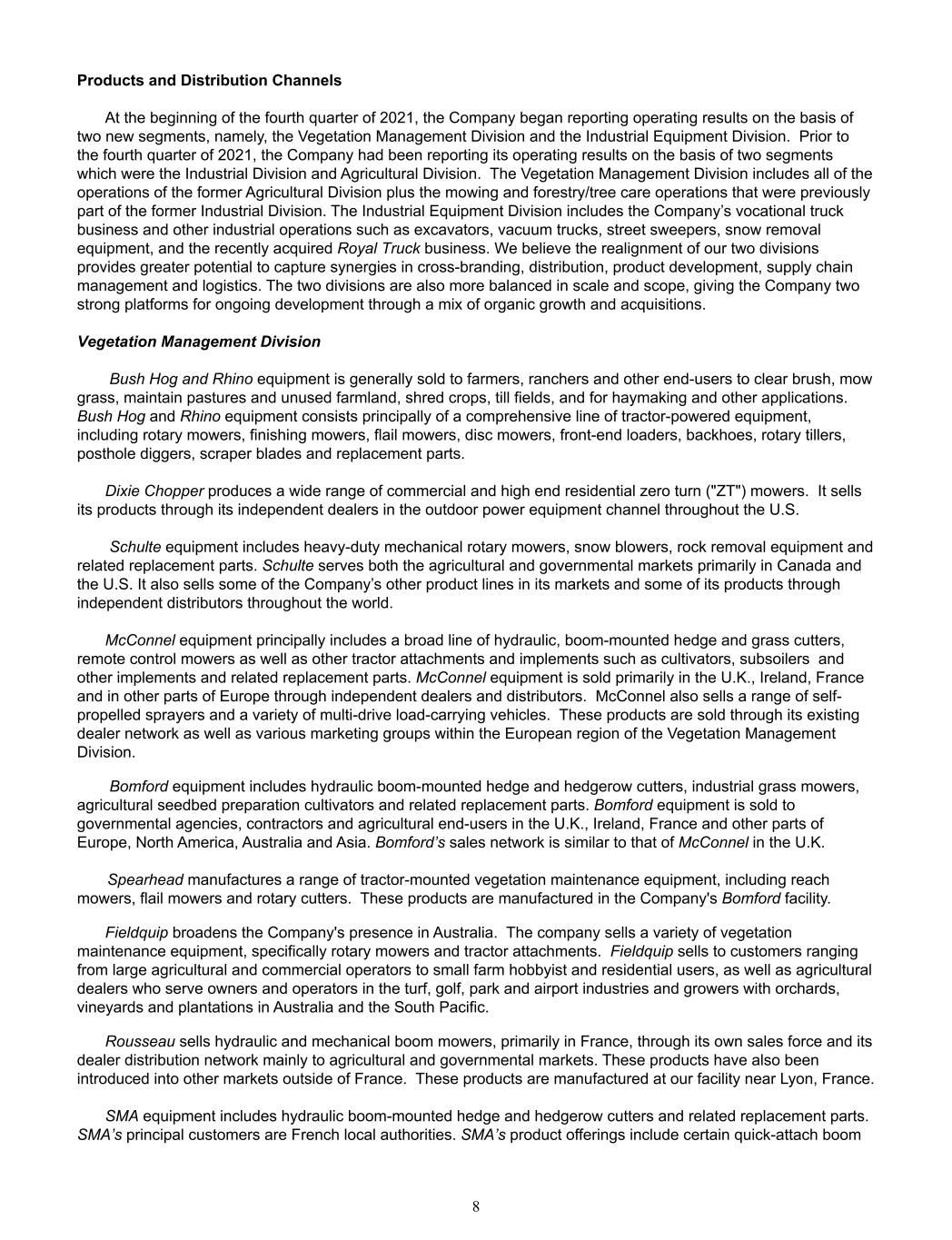 Products and Distribution Channels At the beginning of the fourth quarter of 2021, the Company began reporting operating results on the basis of  two new segments, namely, the Vegetation Management Division and the Industrial Equipment Division.  Prior to  the fourth quarter of 2021, the Company had been reporting its operating results on the basis of two segments  which were the Industrial Division and Agricultural Division.  The Vegetation Management Division includes all of the  operations of the former Agricultural Division plus the mowing and forestry/tree care operations that were previously  part of the former Industrial Division. The Industrial Equipment Division includes the Company’s vocational truck  business and other industrial operations such as excavators, vacuum trucks, street sweepers, snow removal  equipment, and the recently acquired Royal Truck business. We believe the realignment of our two divisions  provides greater potential to capture synergies in cross-branding, distribution, product development, supply chain  management and logistics. The two divisions are also more balanced in scale and scope, giving the Company two  strong platforms for ongoing development through a mix of organic growth and acquisitions. Vegetation Management Division  Bush Hog and Rhino equipment is generally sold to farmers, ranchers and other end-users to clear brush, mow  grass, maintain pastures and unused farmland, shred crops, till fields, and for haymaking and other applications.  Bush Hog and Rhino equipment consists principally of a comprehensive line of tractor-powered equipment,  including rotary mowers, finishing mowers, flail mowers, disc mowers, front-end loaders, backhoes, rotary tillers,  posthole diggers, scraper blades and replacement parts.   Dixie Chopper produces a wide range of commercial and high end residential zero turn ("ZT") mowers.  It sells  its products through its independent dealers in the outdoor power equipment channel throughout the U.S.    Schulte equipment includes heavy-duty mechanical rotary mowers, snow blowers, rock removal equipment and  related replacement parts. Schulte serves both the agricultural and governmental markets primarily in Canada and  the U.S. It also sells some of the Company’s other product lines in its markets and some of its products through  independent distributors throughout the world. McConnel equipment principally includes a broad line of hydraulic, boom-mounted hedge and grass cutters,  remote control mowers as well as other tractor attachments and implements such as cultivators, subsoilers  and  other implements and related replacement parts. McConnel equipment is sold primarily in the U.K., Ireland, France  and in other parts of Europe through independent dealers and distributors.  McConnel also sells a range of self- propelled sprayers and a variety of multi-drive load-carrying vehicles.  These products are sold through its existing  dealer network as well as various marketing groups within the European region of the Vegetation Management  Division.  Bomford equipment includes hydraulic boom-mounted hedge and hedgerow cutters, industrial grass mowers,  agricultural seedbed preparation cultivators and related replacement parts. Bomford equipment is sold to  governmental agencies, contractors and agricultural end-users in the U.K., Ireland, France and other parts of  Europe, North America, Australia and Asia. Bomford’s sales network is similar to that of McConnel in the U.K.         Spearhead manufactures a range of tractor-mounted vegetation maintenance equipment, including reach  mowers, flail mowers and rotary cutters.  These products are manufactured in the Company's Bomford facility. Fieldquip broadens the Company's presence in Australia.  The company sells a variety of vegetation  maintenance equipment, specifically rotary mowers and tractor attachments.  Fieldquip sells to customers ranging  from large agricultural and commercial operators to small farm hobbyist and residential users, as well as agricultural  dealers who serve owners and operators in the turf, golf, park and airport industries and growers with orchards,  vineyards and plantations in Australia and the South Pacific. Rousseau sells hydraulic and mechanical boom mowers, primarily in France, through its own sales force and its  dealer distribution network mainly to agricultural and governmental markets. These products have also been  introduced into other markets outside of France.  These products are manufactured at our facility near Lyon, France. SMA equipment includes hydraulic boom-mounted hedge and hedgerow cutters and related replacement parts.  SMA’s principal customers are French local authorities. SMA’s product offerings include certain quick-attach boom  8