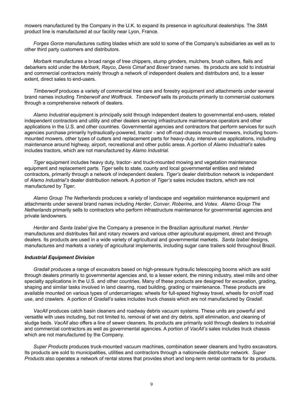 mowers manufactured by the Company in the U.K. to expand its presence in agricultural dealerships. The SMA  product line is manufactured at our facility near Lyon, France.  Forges Gorce manufactures cutting blades which are sold to some of the Company’s subsidiaries as well as to  other third party customers and distributors. Morbark manufactures a broad range of tree chippers, stump grinders, mulchers, brush cutters, flails and  debarkers sold under the Morbark, Rayco, Denis Cimaf and Boxer brand names.  Its products are sold to industrial  and commercial contractors mainly through a network of independent dealers and distributors and, to a lesser  extent, direct sales to end-users.  Timberwolf produces a variety of commercial tree care and forestry equipment and attachments under several  brand names including Timberwolf and Wolftrack.  Timberwolf sells its products primarily to commercial customers  through a comprehensive network of dealers. Alamo Industrial equipment is principally sold through independent dealers to governmental end-users, related  independent contractors and utility and other dealers serving infrastructure maintenance operators and other  applications in the U.S. and other countries. Governmental agencies and contractors that perform services for such  agencies purchase primarily hydraulically-powered, tractor - and off-road chassis mounted mowers, including boom- mounted mowers, other types of cutters and replacement parts for heavy-duty, intensive use applications, including  maintenance around highway, airport, recreational and other public areas. A portion of Alamo Industrial’s sales  includes tractors, which are not manufactured by Alamo Industrial. Tiger equipment includes heavy duty, tractor- and truck-mounted mowing and vegetation maintenance  equipment and replacement parts. Tiger sells to state, county and local governmental entities and related  contractors, primarily through a network of independent dealers. Tiger’s dealer distribution network is independent  of Alamo Industrial’s dealer distribution network. A portion of Tiger’s sales includes tractors, which are not  manufactured by Tiger. Alamo Group The Netherlands produces a variety of landscape and vegetation maintenance equipment and  attachments under several brand names including Herder, Conver, Roberine, and Votex.  Alamo Group The  Netherlands primarily sells to contractors who perform infrastructure maintenance for governmental agencies and  private landowners. Herder and Santa Izabel give the Company a presence in the Brazilian agricultural market. Herder  manufactures and distributes flail and rotary mowers and various other agricultural equipment, direct and through  dealers. Its products are used in a wide variety of agricultural and governmental markets.  Santa Izabel designs,  manufactures and markets a variety of agricultural implements, including sugar cane trailers sold throughout Brazil. Industrial Equipment Division Gradall produces a range of excavators based on high-pressure hydraulic telescoping booms which are sold  through dealers primarily to governmental agencies and, to a lesser extent, the mining industry, steel mills and other  specialty applications in the U.S. and other countries. Many of these products are designed for excavation, grading,  shaping and similar tasks involved in land clearing, road building, grading or maintenance. These products are  available mounted on various types of undercarriages: wheels for full-speed highway travel, wheels for on/off road  use, and crawlers.  A portion of Gradall’s sales includes truck chassis which are not manufactured by Gradall. VacAll produces catch basin cleaners and roadway debris vacuum systems. These units are powerful and  versatile with uses including, but not limited to, removal of wet and dry debris, spill elimination, and cleaning of  sludge beds. VacAll also offers a line of sewer cleaners. Its products are primarily sold through dealers to industrial  and commercial contractors as well as governmental agencies. A portion of VacAll’s sales includes truck chassis  which are not manufactured by the Company. Super Products produces truck-mounted vacuum machines, combination sewer cleaners and hydro excavators.   Its products are sold to municipalities, utilities and contractors through a nationwide distributor network.  Super  Products also operates a network of rental stores that provides short and long-term rental contracts for its products.   9