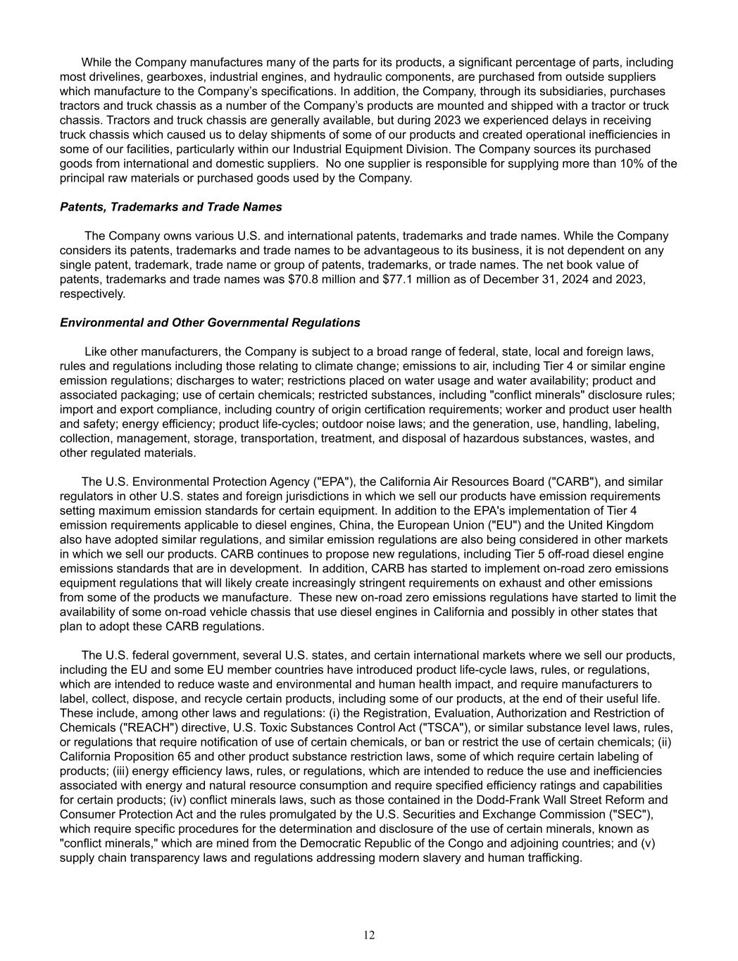 While the Company manufactures many of the parts for its products, a significant percentage of parts, including  most drivelines, gearboxes, industrial engines, and hydraulic components, are purchased from outside suppliers  which manufacture to the Company’s specifications. In addition, the Company, through its subsidiaries, purchases  tractors and truck chassis as a number of the Company’s products are mounted and shipped with a tractor or truck  chassis. Tractors and truck chassis are generally available, but during 2023 we experienced delays in receiving  truck chassis which caused us to delay shipments of some of our products and created operational inefficiencies in  some of our facilities, particularly within our Industrial Equipment Division. The Company sources its purchased  goods from international and domestic suppliers.  No one supplier is responsible for supplying more than 10% of the  principal raw materials or purchased goods used by the Company.    Patents, Trademarks and Trade Names    The Company owns various U.S. and international patents, trademarks and trade names. While the Company  considers its patents, trademarks and trade names to be advantageous to its business, it is not dependent on any  single patent, trademark, trade name or group of patents, trademarks, or trade names. The net book value of  patents, trademarks and trade names was $70.8 million and $77.1 million as of December 31, 2024 and 2023,  respectively.  Environmental and Other Governmental Regulations  Like other manufacturers, the Company is subject to a broad range of federal, state, local and foreign laws,  rules and regulations including those relating to climate change; emissions to air, including Tier 4 or similar engine  emission regulations; discharges to water; restrictions placed on water usage and water availability; product and  associated packaging; use of certain chemicals; restricted substances, including "conflict minerals" disclosure rules;  import and export compliance, including country of origin certification requirements; worker and product user health  and safety; energy efficiency; product life-cycles; outdoor noise laws; and the generation, use, handling, labeling,  collection, management, storage, transportation, treatment, and disposal of hazardous substances, wastes, and  other regulated materials.  The U.S. Environmental Protection Agency ("EPA"), the California Air Resources Board ("CARB"), and similar  regulators in other U.S. states and foreign jurisdictions in which we sell our products have emission requirements  setting maximum emission standards for certain equipment. In addition to the EPA's implementation of Tier 4  emission requirements applicable to diesel engines, China, the European Union ("EU") and the United Kingdom  also have adopted similar regulations, and similar emission regulations are also being considered in other markets  in which we sell our products. CARB continues to propose new regulations, including Tier 5 off-road diesel engine  emissions standards that are in development.  In addition, CARB has started to implement on-road zero emissions  equipment regulations that will likely create increasingly stringent requirements on exhaust and other emissions  from some of the products we manufacture.  These new on-road zero emissions regulations have started to limit the  availability of some on-road vehicle chassis that use diesel engines in California and possibly in other states that  plan to adopt these CARB regulations. The U.S. federal government, several U.S. states, and certain international markets where we sell our products,  including the EU and some EU member countries have introduced product life-cycle laws, rules, or regulations,  which are intended to reduce waste and environmental and human health impact, and require manufacturers to  label, collect, dispose, and recycle certain products, including some of our products, at the end of their useful life.   These include, among other laws and regulations: (i) the Registration, Evaluation, Authorization and Restriction of  Chemicals ("REACH") directive, U.S. Toxic Substances Control Act ("TSCA"), or similar substance level laws, rules,  or regulations that require notification of use of certain chemicals, or ban or restrict the use of certain chemicals; (ii)  California Proposition 65 and other product substance restriction laws, some of which require certain labeling of  products; (iii) energy efficiency laws, rules, or regulations, which are intended to reduce the use and inefficiencies  associated with energy and natural resource consumption and require specified efficiency ratings and capabilities  for certain products; (iv) conflict minerals laws, such as those contained in the Dodd-Frank Wall Street Reform and  Consumer Protection Act and the rules promulgated by the U.S. Securities and Exchange Commission ("SEC"),  which require specific procedures for the determination and disclosure of the use of certain minerals, known as  "conflict minerals," which are mined from the Democratic Republic of the Congo and adjoining countries; and (v)  supply chain transparency laws and regulations addressing modern slavery and human trafficking. 12