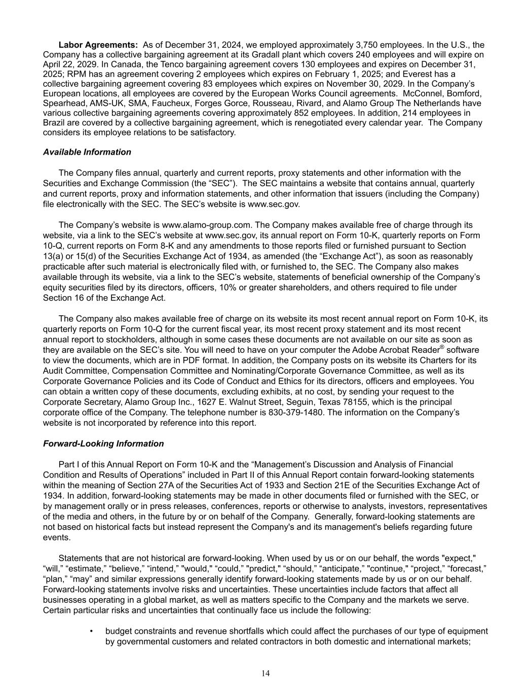 Labor Agreements:  As of December 31, 2024, we employed approximately 3,750 employees. In the U.S., the  Company has a collective bargaining agreement at its Gradall plant which covers 240 employees and will expire on  April 22, 2029. In Canada, the Tenco bargaining agreement covers 130 employees and expires on December 31,  2025; RPM has an agreement covering 2 employees which expires on February 1, 2025; and Everest has a  collective bargaining agreement covering 83 employees which expires on November 30, 2029. In the Company’s  European locations, all employees are covered by the European Works Council agreements.  McConnel, Bomford,  Spearhead, AMS-UK, SMA, Faucheux, Forges Gorce, Rousseau, Rivard, and Alamo Group The Netherlands have  various collective bargaining agreements covering approximately 852 employees. In addition, 214 employees in  Brazil are covered by a collective bargaining agreement, which is renegotiated every calendar year.  The Company  considers its employee relations to be satisfactory.   Available Information The Company files annual, quarterly and current reports, proxy statements and other information with the  Securities and Exchange Commission (the “SEC”).  The SEC maintains a website that contains annual, quarterly  and current reports, proxy and information statements, and other information that issuers (including the Company)  file electronically with the SEC. The SEC’s website is www.sec.gov. The Company’s website is www.alamo-group.com. The Company makes available free of charge through its  website, via a link to the SEC’s website at www.sec.gov, its annual report on Form 10-K, quarterly reports on Form  10-Q, current reports on Form 8-K and any amendments to those reports filed or furnished pursuant to Section  13(a) or 15(d) of the Securities Exchange Act of 1934, as amended (the “Exchange Act”), as soon as reasonably  practicable after such material is electronically filed with, or furnished to, the SEC. The Company also makes  available through its website, via a link to the SEC’s website, statements of beneficial ownership of the Company’s  equity securities filed by its directors, officers, 10% or greater shareholders, and others required to file under  Section 16 of the Exchange Act. The Company also makes available free of charge on its website its most recent annual report on Form 10-K, its  quarterly reports on Form 10-Q for the current fiscal year, its most recent proxy statement and its most recent  annual report to stockholders, although in some cases these documents are not available on our site as soon as  they are available on the SEC’s site. You will need to have on your computer the Adobe Acrobat Reader® software  to view the documents, which are in PDF format. In addition, the Company posts on its website its Charters for its  Audit Committee, Compensation Committee and Nominating/Corporate Governance Committee, as well as its  Corporate Governance Policies and its Code of Conduct and Ethics for its directors, officers and employees. You  can obtain a written copy of these documents, excluding exhibits, at no cost, by sending your request to the  Corporate Secretary, Alamo Group Inc., 1627 E. Walnut Street, Seguin, Texas 78155, which is the principal  corporate office of the Company. The telephone number is 830-379-1480. The information on the Company’s  website is not incorporated by reference into this report. Forward-Looking Information Part I of this Annual Report on Form 10-K and the “Management’s Discussion and Analysis of Financial  Condition and Results of Operations” included in Part II of this Annual Report contain forward-looking statements  within the meaning of Section 27A of the Securities Act of 1933 and Section 21E of the Securities Exchange Act of  1934. In addition, forward-looking statements may be made in other documents filed or furnished with the SEC, or  by management orally or in press releases, conferences, reports or otherwise to analysts, investors, representatives  of the media and others, in the future by or on behalf of the Company.  Generally, forward-looking statements are  not based on historical facts but instead represent the Company's and its management's beliefs regarding future  events. Statements that are not historical are forward-looking. When used by us or on our behalf, the words "expect,"  “will,” “estimate,” “believe,” “intend,” "would," “could,” "predict," “should,” “anticipate,” "continue," “project,” “forecast,”  “plan,” “may” and similar expressions generally identify forward-looking statements made by us or on our behalf.  Forward-looking statements involve risks and uncertainties. These uncertainties include factors that affect all  businesses operating in a global market, as well as matters specific to the Company and the markets we serve.  Certain particular risks and uncertainties that continually face us include the following: • budget constraints and revenue shortfalls which could affect the purchases of our type of equipment  by governmental customers and related contractors in both domestic and international markets; 14