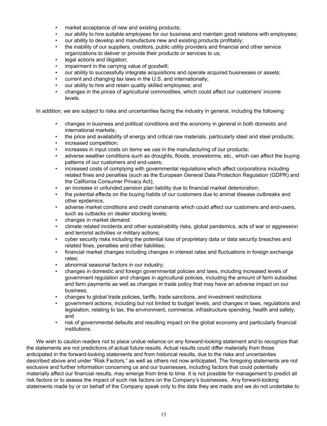 • market acceptance of new and existing products; • our ability to hire suitable employees for our business and maintain good relations with employees; • our ability to develop and manufacture new and existing products profitably; • the inability of our suppliers, creditors, public utility providers and financial and other service  organizations to deliver or provide their products or services to us; • legal actions and litigation; • impairment in the carrying value of goodwill; • our ability to successfully integrate acquisitions and operate acquired businesses or assets; • current and changing tax laws in the U.S. and internationally;  • our ability to hire and retain quality skilled employees; and • changes in the prices of agricultural commodities, which could affect our customers’ income levels. In addition, we are subject to risks and uncertainties facing the industry in general, including the following: • changes in business and political conditions and the economy in general in both domestic and  international markets; • the price and availability of energy and critical raw materials, particularly steel and steel products; • increased competition; • increases in input costs on items we use in the manufacturing of our products;  • adverse weather conditions such as droughts, floods, snowstorms, etc., which can affect the buying  patterns of our customers and end-users; • increased costs of complying with governmental regulations which affect corporations including  related fines and penalties (such as the European General Data Protection Regulation (GDPR) and  the California Consumer Privacy Act); • an increase in unfunded pension plan liability due to financial market deterioration; • the potential effects on the buying habits of our customers due to animal disease outbreaks and  other epidemics; • adverse market conditions and credit constraints which could affect our customers and end-users,  such as cutbacks on dealer stocking levels; • changes in market demand; • climate related incidents and other sustainability risks, global pandemics, acts of war or aggression  and terrorist activities or military actions; • cyber security risks including the potential loss of proprietary data or data security breaches and  related fines, penalties and other liabilities; • financial market changes including changes in interest rates and fluctuations in foreign exchange  rates; • abnormal seasonal factors in our industry; • changes in domestic and foreign governmental policies and laws, including increased levels of  government regulation and changes in agricultural policies, including the amount of farm subsidies  and farm payments as well as changes in trade policy that may have an adverse impact on our  business; • changes to global trade policies, tariffs, trade sanctions, and investment restrictions • government actions, including but not limited to budget levels, and changes in laws, regulations and  legislation, relating to tax, the environment, commerce, infrastructure spending, health and safety;  and • risk of governmental defaults and resulting impact on the global economy and particularly financial  institutions. We wish to caution readers not to place undue reliance on any forward-looking statement and to recognize that  the statements are not predictions of actual future results. Actual results could differ materially from those  anticipated in the forward-looking statements and from historical results, due to the risks and uncertainties  described above and under “Risk Factors,” as well as others not now anticipated. The foregoing statements are not  exclusive and further information concerning us and our businesses, including factors that could potentially  materially affect our financial results, may emerge from time to time. It is not possible for management to predict all  risk factors or to assess the impact of such risk factors on the Company’s businesses.  Any forward-looking  statements made by or on behalf of the Company speak only to the date they are made and we do not undertake to  15