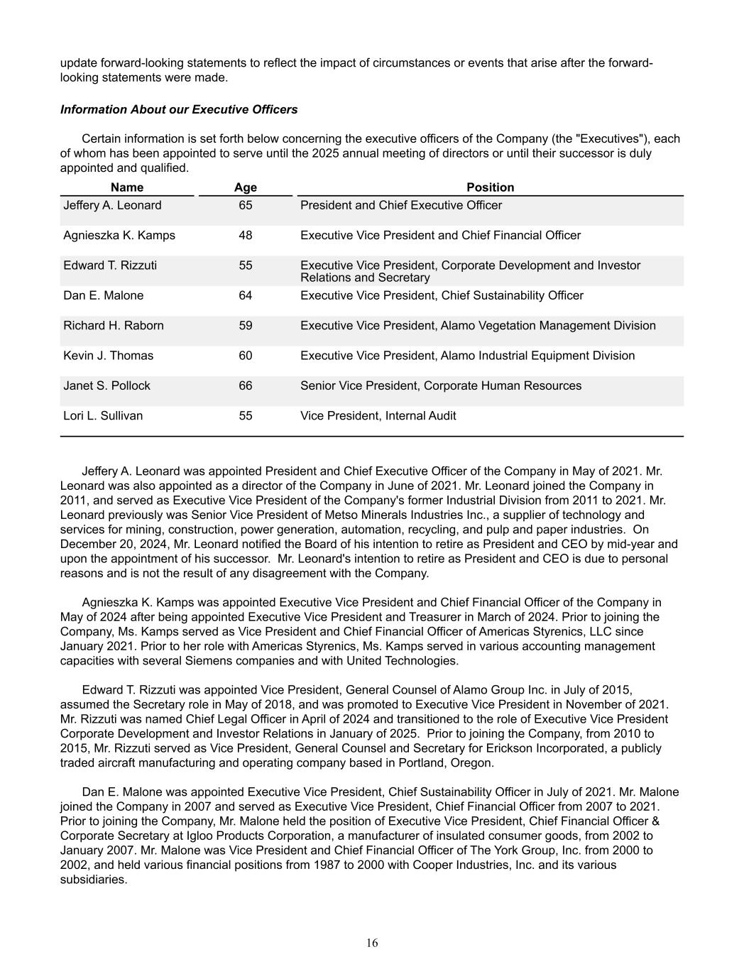 update forward-looking statements to reflect the impact of circumstances or events that arise after the forward- looking statements were made. Information About our Executive Officers     Certain information is set forth below concerning the executive officers of the Company (the "Executives"), each  of whom has been appointed to serve until the 2025 annual meeting of directors or until their successor is duly  appointed and qualified.   Name Age Position Jeffery A. Leonard 65 President and Chief Executive Officer Agnieszka K. Kamps 48 Executive Vice President and Chief Financial Officer Edward T. Rizzuti 55 Executive Vice President, Corporate Development and Investor  Relations and Secretary Dan E. Malone 64 Executive Vice President, Chief Sustainability Officer Richard H. Raborn 59 Executive Vice President, Alamo Vegetation Management Division Kevin J. Thomas 60 Executive Vice President, Alamo Industrial Equipment Division Janet S. Pollock 66 Senior Vice President, Corporate Human Resources Lori L. Sullivan 55 Vice President, Internal Audit  Jeffery A. Leonard was appointed President and Chief Executive Officer of the Company in May of 2021. Mr.  Leonard was also appointed as a director of the Company in June of 2021. Mr. Leonard joined the Company in  2011, and served as Executive Vice President of the Company's former Industrial Division from 2011 to 2021. Mr.  Leonard previously was Senior Vice President of Metso Minerals Industries Inc., a supplier of technology and  services for mining, construction, power generation, automation, recycling, and pulp and paper industries.  On  December 20, 2024, Mr. Leonard notified the Board of his intention to retire as President and CEO by mid-year and  upon the appointment of his successor.  Mr. Leonard's intention to retire as President and CEO is due to personal  reasons and is not the result of any disagreement with the Company.   Agnieszka K. Kamps was appointed Executive Vice President and Chief Financial Officer of the Company in  May of 2024 after being appointed Executive Vice President and Treasurer in March of 2024. Prior to joining the  Company, Ms. Kamps served as Vice President and Chief Financial Officer of Americas Styrenics, LLC since  January 2021. Prior to her role with Americas Styrenics, Ms. Kamps served in various accounting management  capacities with several Siemens companies and with United Technologies. Edward T. Rizzuti was appointed Vice President, General Counsel of Alamo Group Inc. in July of 2015,  assumed the Secretary role in May of 2018, and was promoted to Executive Vice President in November of 2021.   Mr. Rizzuti was named Chief Legal Officer in April of 2024 and transitioned to the role of Executive Vice President  Corporate Development and Investor Relations in January of 2025.  Prior to joining the Company, from 2010 to  2015, Mr. Rizzuti served as Vice President, General Counsel and Secretary for Erickson Incorporated, a publicly  traded aircraft manufacturing and operating company based in Portland, Oregon.  Dan E. Malone was appointed Executive Vice President, Chief Sustainability Officer in July of 2021. Mr. Malone  joined the Company in 2007 and served as Executive Vice President, Chief Financial Officer from 2007 to 2021.  Prior to joining the Company, Mr. Malone held the position of Executive Vice President, Chief Financial Officer &  Corporate Secretary at Igloo Products Corporation, a manufacturer of insulated consumer goods, from 2002 to  January 2007. Mr. Malone was Vice President and Chief Financial Officer of The York Group, Inc. from 2000 to  2002, and held various financial positions from 1987 to 2000 with Cooper Industries, Inc. and its various  subsidiaries. 16