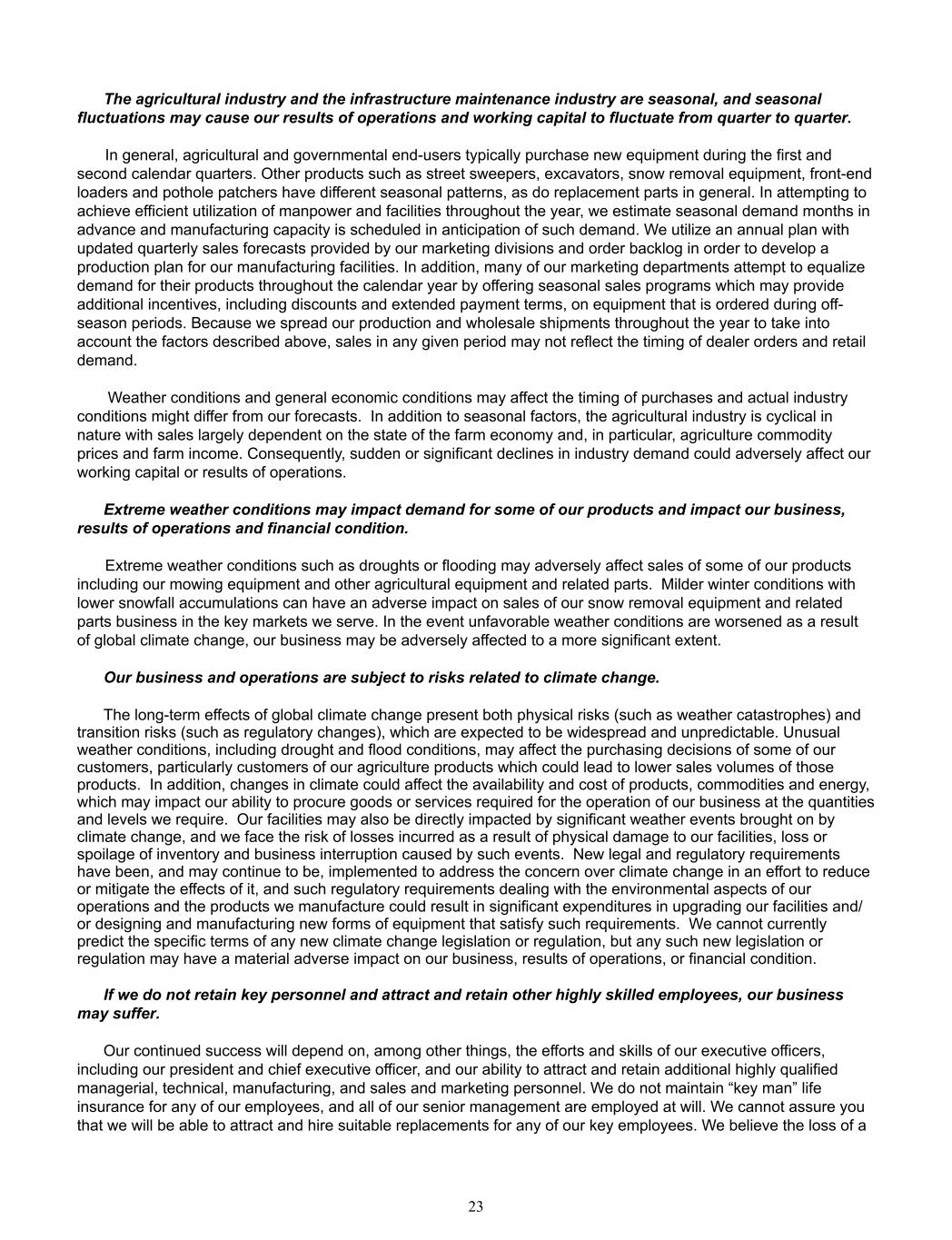 The agricultural industry and the infrastructure maintenance industry are seasonal, and seasonal  fluctuations may cause our results of operations and working capital to fluctuate from quarter to quarter. In general, agricultural and governmental end-users typically purchase new equipment during the first and  second calendar quarters. Other products such as street sweepers, excavators, snow removal equipment, front-end  loaders and pothole patchers have different seasonal patterns, as do replacement parts in general. In attempting to  achieve efficient utilization of manpower and facilities throughout the year, we estimate seasonal demand months in  advance and manufacturing capacity is scheduled in anticipation of such demand. We utilize an annual plan with  updated quarterly sales forecasts provided by our marketing divisions and order backlog in order to develop a  production plan for our manufacturing facilities. In addition, many of our marketing departments attempt to equalize  demand for their products throughout the calendar year by offering seasonal sales programs which may provide  additional incentives, including discounts and extended payment terms, on equipment that is ordered during off- season periods. Because we spread our production and wholesale shipments throughout the year to take into  account the factors described above, sales in any given period may not reflect the timing of dealer orders and retail  demand.  Weather conditions and general economic conditions may affect the timing of purchases and actual industry  conditions might differ from our forecasts.  In addition to seasonal factors, the agricultural industry is cyclical in  nature with sales largely dependent on the state of the farm economy and, in particular, agriculture commodity  prices and farm income. Consequently, sudden or significant declines in industry demand could adversely affect our  working capital or results of operations.  Extreme weather conditions may impact demand for some of our products and impact our business,  results of operations and financial condition. Extreme weather conditions such as droughts or flooding may adversely affect sales of some of our products  including our mowing equipment and other agricultural equipment and related parts.  Milder winter conditions with  lower snowfall accumulations can have an adverse impact on sales of our snow removal equipment and related  parts business in the key markets we serve. In the event unfavorable weather conditions are worsened as a result  of global climate change, our business may be adversely affected to a more significant extent. Our business and operations are subject to risks related to climate change. The long-term effects of global climate change present both physical risks (such as weather catastrophes) and  transition risks (such as regulatory changes), which are expected to be widespread and unpredictable. Unusual  weather conditions, including drought and flood conditions, may affect the purchasing decisions of some of our  customers, particularly customers of our agriculture products which could lead to lower sales volumes of those  products.  In addition, changes in climate could affect the availability and cost of products, commodities and energy,  which may impact our ability to procure goods or services required for the operation of our business at the quantities  and levels we require.  Our facilities may also be directly impacted by significant weather events brought on by  climate change, and we face the risk of losses incurred as a result of physical damage to our facilities, loss or  spoilage of inventory and business interruption caused by such events.  New legal and regulatory requirements  have been, and may continue to be, implemented to address the concern over climate change in an effort to reduce  or mitigate the effects of it, and such regulatory requirements dealing with the environmental aspects of our  operations and the products we manufacture could result in significant expenditures in upgrading our facilities and/ or designing and manufacturing new forms of equipment that satisfy such requirements.  We cannot currently  predict the specific terms of any new climate change legislation or regulation, but any such new legislation or  regulation may have a material adverse impact on our business, results of operations, or financial condition. If we do not retain key personnel and attract and retain other highly skilled employees, our business  may suffer. Our continued success will depend on, among other things, the efforts and skills of our executive officers,  including our president and chief executive officer, and our ability to attract and retain additional highly qualified  managerial, technical, manufacturing, and sales and marketing personnel. We do not maintain “key man” life  insurance for any of our employees, and all of our senior management are employed at will. We cannot assure you  that we will be able to attract and hire suitable replacements for any of our key employees. We believe the loss of a  23