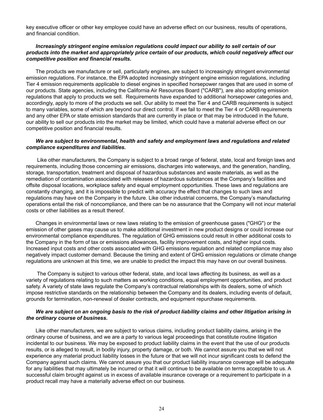 key executive officer or other key employee could have an adverse effect on our business, results of operations,  and financial condition. Increasingly stringent engine emission regulations could impact our ability to sell certain of our  products into the market and appropriately price certain of our products, which could negatively affect our  competitive position and financial results. The products we manufacture or sell, particularly engines, are subject to increasingly stringent environmental  emission regulations. For instance, the EPA adopted increasingly stringent engine emission regulations, including  Tier 4 emission requirements applicable to diesel engines in specified horsepower ranges that are used in some of  our products. State agencies, including the California Air Resources Board ("CARB"), are also adopting emission  regulations that apply to products we sell.  Requirements have expanded to additional horsepower categories and,  accordingly, apply to more of the products we sell. Our ability to meet the Tier 4 and CARB requirements is subject  to many variables, some of which are beyond our direct control. If we fail to meet the Tier 4 or CARB requirements  and any other EPA or state emission standards that are currently in place or that may be introduced in the future,  our ability to sell our products into the market may be limited, which could have a material adverse effect on our  competitive position and financial results.   We are subject to environmental, health and safety and employment laws and regulations and related  compliance expenditures and liabilities.  Like other manufacturers, the Company is subject to a broad range of federal, state, local and foreign laws and  requirements, including those concerning air emissions, discharges into waterways, and the generation, handling,  storage, transportation, treatment and disposal of hazardous substances and waste materials, as well as the  remediation of contamination associated with releases of hazardous substances at the Company’s facilities and  offsite disposal locations, workplace safety and equal employment opportunities. These laws and regulations are  constantly changing, and it is impossible to predict with accuracy the effect that changes to such laws and  regulations may have on the Company in the future. Like other industrial concerns, the Company’s manufacturing  operations entail the risk of noncompliance, and there can be no assurance that the Company will not incur material  costs or other liabilities as a result thereof. Changes in environmental laws or new laws relating to the emission of greenhouse gases ("GHG") or the  emission of other gases may cause us to make additional investment in new product designs or could increase our  environmental compliance expenditures. The regulation of GHG emissions could result in other additional costs to  the Company in the form of tax or emissions allowances, facility improvement costs, and higher input costs.   Increased input costs and other costs associated with GHG emissions regulation and related compliance may also  negatively impact customer demand. Because the timing and extent of GHG emission regulations or climate change  regulations are unknown at this time, we are unable to predict the impact this may have on our overall business.    The Company is subject to various other federal, state, and local laws affecting its business, as well as a  variety of regulations relating to such matters as working conditions, equal employment opportunities, and product  safety. A variety of state laws regulate the Company’s contractual relationships with its dealers, some of which  impose restrictive standards on the relationship between the Company and its dealers, including events of default,  grounds for termination, non-renewal of dealer contracts, and equipment repurchase requirements.  We are subject on an ongoing basis to the risk of product liability claims and other litigation arising in  the ordinary course of business. Like other manufacturers, we are subject to various claims, including product liability claims, arising in the  ordinary course of business, and we are a party to various legal proceedings that constitute routine litigation  incidental to our business. We may be exposed to product liability claims in the event that the use of our products  results, or is alleged to result, in bodily injury, property damage, or both. We cannot assure you that we will not  experience any material product liability losses in the future or that we will not incur significant costs to defend the  Company against such claims. We cannot assure you that our product liability insurance coverage will be adequate  for any liabilities that may ultimately be incurred or that it will continue to be available on terms acceptable to us. A  successful claim brought against us in excess of available insurance coverage or a requirement to participate in a  product recall may have a materially adverse effect on our business. 24