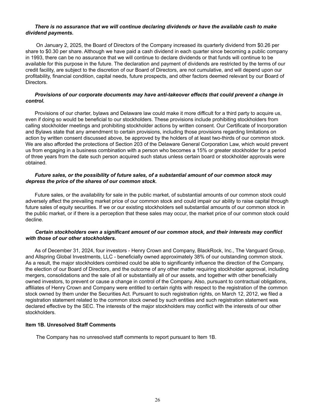 There is no assurance that we will continue declaring dividends or have the available cash to make  dividend payments.    On January 2, 2025, the Board of Directors of the Company increased its quarterly dividend from $0.26 per  share to $0.30 per share. Although we have paid a cash dividend in each quarter since becoming a public company  in 1993, there can be no assurance that we will continue to declare dividends or that funds will continue to be  available for this purpose in the future. The declaration and payment of dividends are restricted by the terms of our  credit facility, are subject to the discretion of our Board of Directors, are not cumulative, and will depend upon our  profitability, financial condition, capital needs, future prospects, and other factors deemed relevant by our Board of  Directors. Provisions of our corporate documents may have anti-takeover effects that could prevent a change in  control.   Provisions of our charter, bylaws and Delaware law could make it more difficult for a third party to acquire us,  even if doing so would be beneficial to our stockholders. These provisions include prohibiting stockholders from  calling stockholder meetings and prohibiting stockholder actions by written consent. Our Certificate of Incorporation  and Bylaws state that any amendment to certain provisions, including those provisions regarding limitations on  action by written consent discussed above, be approved by the holders of at least two-thirds of our common stock.  We are also afforded the protections of Section 203 of the Delaware General Corporation Law, which would prevent  us from engaging in a business combination with a person who becomes a 15% or greater stockholder for a period  of three years from the date such person acquired such status unless certain board or stockholder approvals were  obtained. Future sales, or the possibility of future sales, of a substantial amount of our common stock may  depress the price of the shares of our common stock.   Future sales, or the availability for sale in the public market, of substantial amounts of our common stock could  adversely affect the prevailing market price of our common stock and could impair our ability to raise capital through  future sales of equity securities. If we or our existing stockholders sell substantial amounts of our common stock in  the public market, or if there is a perception that these sales may occur, the market price of our common stock could  decline.    Certain stockholders own a significant amount of our common stock, and their interests may conflict  with those of our other stockholders.   As of December 31, 2024, four investors - Henry Crown and Company, BlackRock, Inc., The Vanguard Group,  and Allspring Global Investments, LLC - beneficially owned approximately 38% of our outstanding common stock.  As a result, the major stockholders combined could be able to significantly influence the direction of the Company,  the election of our Board of Directors, and the outcome of any other matter requiring stockholder approval, including  mergers, consolidations and the sale of all or substantially all of our assets, and together with other beneficially  owned investors, to prevent or cause a change in control of the Company. Also, pursuant to contractual obligations,  affiliates of Henry Crown and Company were entitled to certain rights with respect to the registration of the common  stock owned by them under the Securities Act. Pursuant to such registration rights, on March 12, 2012, we filed a  registration statement related to the common stock owned by such entities and such registration statement was  declared effective by the SEC. The interests of the major stockholders may conflict with the interests of our other  stockholders.  Item 1B. Unresolved Staff Comments   The Company has no unresolved staff comments to report pursuant to Item 1B. 26