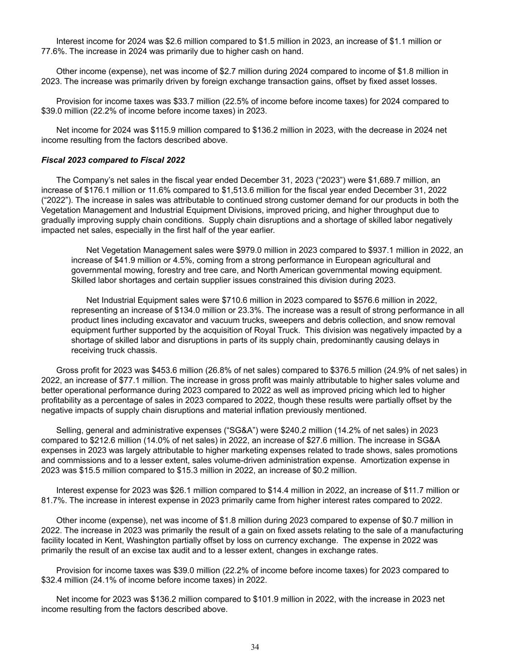 Interest income for 2024 was $2.6 million compared to $1.5 million in 2023, an increase of $1.1 million or  77.6%. The increase in 2024 was primarily due to higher cash on hand. Other income (expense), net was income of $2.7 million during 2024 compared to income of $1.8 million in  2023. The increase was primarily driven by foreign exchange transaction gains, offset by fixed asset losses.  Provision for income taxes was $33.7 million (22.5% of income before income taxes) for 2024 compared to  $39.0 million (22.2% of income before income taxes) in 2023.   Net income for 2024 was $115.9 million compared to $136.2 million in 2023, with the decrease in 2024 net  income resulting from the factors described above. Fiscal 2023 compared to Fiscal 2022    The Company’s net sales in the fiscal year ended December 31, 2023 (“2023”) were $1,689.7 million, an  increase of $176.1 million or 11.6% compared to $1,513.6 million for the fiscal year ended December 31, 2022  (“2022”). The increase in sales was attributable to continued strong customer demand for our products in both the  Vegetation Management and Industrial Equipment Divisions, improved pricing, and higher throughput due to  gradually improving supply chain conditions.  Supply chain disruptions and a shortage of skilled labor negatively  impacted net sales, especially in the first half of the year earlier. Net Vegetation Management sales were $979.0 million in 2023 compared to $937.1 million in 2022, an  increase of $41.9 million or 4.5%, coming from a strong performance in European agricultural and  governmental mowing, forestry and tree care, and North American governmental mowing equipment.   Skilled labor shortages and certain supplier issues constrained this division during 2023. Net Industrial Equipment sales were $710.6 million in 2023 compared to $576.6 million in 2022,  representing an increase of $134.0 million or 23.3%. The increase was a result of strong performance in all  product lines including excavator and vacuum trucks, sweepers and debris collection, and snow removal  equipment further supported by the acquisition of Royal Truck.  This division was negatively impacted by a  shortage of skilled labor and disruptions in parts of its supply chain, predominantly causing delays in  receiving truck chassis. Gross profit for 2023 was $453.6 million (26.8% of net sales) compared to $376.5 million (24.9% of net sales) in  2022, an increase of $77.1 million. The increase in gross profit was mainly attributable to higher sales volume and  better operational performance during 2023 compared to 2022 as well as improved pricing which led to higher  profitability as a percentage of sales in 2023 compared to 2022, though these results were partially offset by the  negative impacts of supply chain disruptions and material inflation previously mentioned. Selling, general and administrative expenses (“SG&A”) were $240.2 million (14.2% of net sales) in 2023  compared to $212.6 million (14.0% of net sales) in 2022, an increase of $27.6 million. The increase in SG&A  expenses in 2023 was largely attributable to higher marketing expenses related to trade shows, sales promotions  and commissions and to a lesser extent, sales volume-driven administration expense.  Amortization expense in  2023 was $15.5 million compared to $15.3 million in 2022, an increase of $0.2 million.     Interest expense for 2023 was $26.1 million compared to $14.4 million in 2022, an increase of $11.7 million or  81.7%. The increase in interest expense in 2023 primarily came from higher interest rates compared to 2022. Other income (expense), net was income of $1.8 million during 2023 compared to expense of $0.7 million in  2022. The increase in 2023 was primarily the result of a gain on fixed assets relating to the sale of a manufacturing  facility located in Kent, Washington partially offset by loss on currency exchange.  The expense in 2022 was  primarily the result of an excise tax audit and to a lesser extent, changes in exchange rates. Provision for income taxes was $39.0 million (22.2% of income before income taxes) for 2023 compared to  $32.4 million (24.1% of income before income taxes) in 2022.   Net income for 2023 was $136.2 million compared to $101.9 million in 2022, with the increase in 2023 net  income resulting from the factors described above. 34