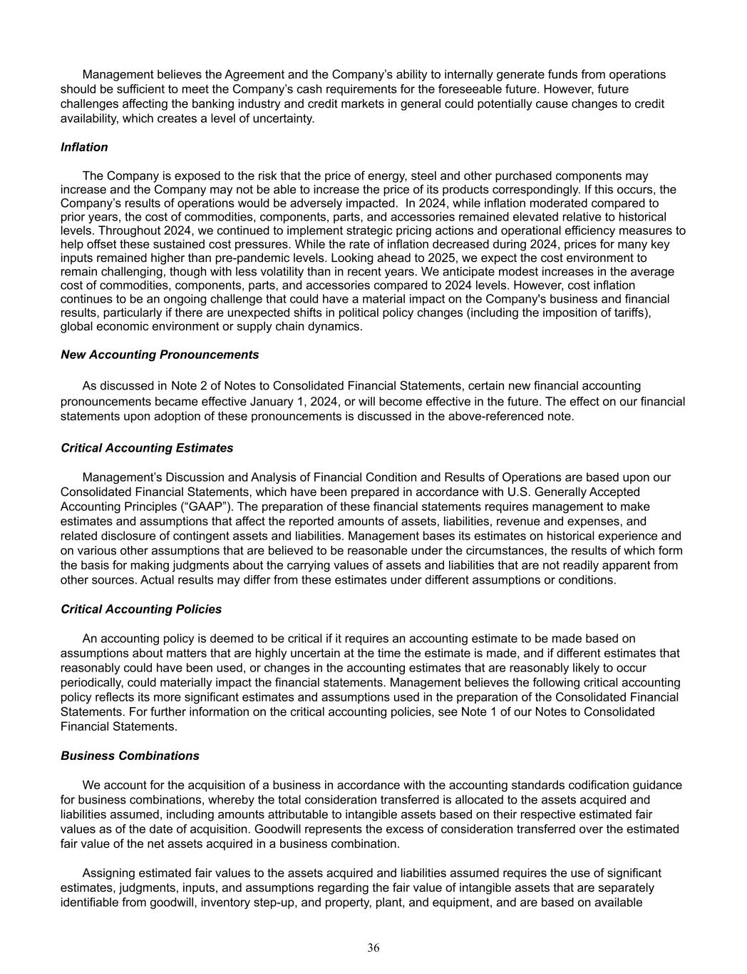 Management believes the Agreement and the Company’s ability to internally generate funds from operations  should be sufficient to meet the Company’s cash requirements for the foreseeable future. However, future  challenges affecting the banking industry and credit markets in general could potentially cause changes to credit  availability, which creates a level of uncertainty. Inflation   The Company is exposed to the risk that the price of energy, steel and other purchased components may  increase and the Company may not be able to increase the price of its products correspondingly. If this occurs, the  Company’s results of operations would be adversely impacted.  In 2024, while inflation moderated compared to  prior years, the cost of commodities, components, parts, and accessories remained elevated relative to historical  levels. Throughout 2024, we continued to implement strategic pricing actions and operational efficiency measures to  help offset these sustained cost pressures. While the rate of inflation decreased during 2024, prices for many key  inputs remained higher than pre-pandemic levels. Looking ahead to 2025, we expect the cost environment to  remain challenging, though with less volatility than in recent years. We anticipate modest increases in the average  cost of commodities, components, parts, and accessories compared to 2024 levels. However, cost inflation  continues to be an ongoing challenge that could have a material impact on the Company's business and financial  results, particularly if there are unexpected shifts in political policy changes (including the imposition of tariffs),  global economic environment or supply chain dynamics.  New Accounting Pronouncements As discussed in Note 2 of Notes to Consolidated Financial Statements, certain new financial accounting  pronouncements became effective January 1, 2024, or will become effective in the future. The effect on our financial  statements upon adoption of these pronouncements is discussed in the above-referenced note.  Payment due by period Critical Accounting Estimates Management’s Discussion and Analysis of Financial Condition and Results of Operations are based upon our  Consolidated Financial Statements, which have been prepared in accordance with U.S. Generally Accepted  Accounting Principles (“GAAP”). The preparation of these financial statements requires management to make  estimates and assumptions that affect the reported amounts of assets, liabilities, revenue and expenses, and  related disclosure of contingent assets and liabilities. Management bases its estimates on historical experience and  on various other assumptions that are believed to be reasonable under the circumstances, the results of which form  the basis for making judgments about the carrying values of assets and liabilities that are not readily apparent from  other sources. Actual results may differ from these estimates under different assumptions or conditions. Critical Accounting Policies An accounting policy is deemed to be critical if it requires an accounting estimate to be made based on  assumptions about matters that are highly uncertain at the time the estimate is made, and if different estimates that  reasonably could have been used, or changes in the accounting estimates that are reasonably likely to occur  periodically, could materially impact the financial statements. Management believes the following critical accounting  policy reflects its more significant estimates and assumptions used in the preparation of the Consolidated Financial  Statements. For further information on the critical accounting policies, see Note 1 of our Notes to Consolidated  Financial Statements. Business Combinations We account for the acquisition of a business in accordance with the accounting standards codification guidance  for business combinations, whereby the total consideration transferred is allocated to the assets acquired and  liabilities assumed, including amounts attributable to intangible assets based on their respective estimated fair  values as of the date of acquisition. Goodwill represents the excess of consideration transferred over the estimated  fair value of the net assets acquired in a business combination.  Assigning estimated fair values to the assets acquired and liabilities assumed requires the use of significant  estimates, judgments, inputs, and assumptions regarding the fair value of intangible assets that are separately  identifiable from goodwill, inventory step-up, and property, plant, and equipment, and are based on available  36