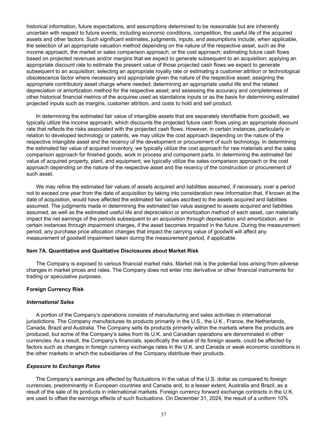 historical information, future expectations, and assumptions determined to be reasonable but are inherently  uncertain with respect to future events, including economic conditions, competition, the useful life of the acquired  assets and other factors. Such significant estimates, judgments, inputs, and assumptions include, when applicable,  the selection of an appropriate valuation method depending on the nature of the respective asset, such as the  income approach, the market or sales comparison approach, or the cost approach; estimating future cash flows  based on projected revenues and/or margins that we expect to generate subsequent to an acquisition; applying an  appropriate discount rate to estimate the present value of those projected cash flows we expect to generate  subsequent to an acquisition; selecting an appropriate royalty rate or estimating a customer attrition or technological  obsolescence factor where necessary and appropriate given the nature of the respective asset; assigning the  appropriate contributory asset charge where needed; determining an appropriate useful life and the related  depreciation or amortization method for the respective asset; and assessing the accuracy and completeness of  other historical financial metrics of the acquiree used as standalone inputs or as the basis for determining estimated  projected inputs such as margins, customer attrition, and costs to hold and sell product.  In determining the estimated fair value of intangible assets that are separately identifiable from goodwill, we  typically utilize the income approach, which discounts the projected future cash flows using an appropriate discount  rate that reflects the risks associated with the projected cash flows. However, in certain instances, particularly in  relation to developed technology or patents, we may utilize the cost approach depending on the nature of the  respective intangible asset and the recency of the development or procurement of such technology. In determining  the estimated fair value of acquired inventory, we typically utilize the cost approach for raw materials and the sales  comparison approach for finished goods, work in process and component parts. In determining the estimated fair  value of acquired property, plant, and equipment, we typically utilize the sales comparison approach or the cost  approach depending on the nature of the respective asset and the recency of the construction or procurement of  such asset.  We may refine the estimated fair values of assets acquired and liabilities assumed, if necessary, over a period  not to exceed one year from the date of acquisition by taking into consideration new information that, if known at the  date of acquisition, would have affected the estimated fair values ascribed to the assets acquired and liabilities  assumed. The judgments made in determining the estimated fair value assigned to assets acquired and liabilities  assumed, as well as the estimated useful life and depreciation or amortization method of each asset, can materially  impact the net earnings of the periods subsequent to an acquisition through depreciation and amortization, and in  certain instances through impairment charges, if the asset becomes impaired in the future. During the measurement  period, any purchase price allocation changes that impact the carrying value of goodwill will affect any  measurement of goodwill impairment taken during the measurement period, if applicable. Item 7A. Quantitative and Qualitative Disclosures about Market Risk   The Company is exposed to various financial market risks. Market risk is the potential loss arising from adverse  changes in market prices and rates. The Company does not enter into derivative or other financial instruments for  trading or speculative purposes.   Foreign Currency Risk   International Sales A portion of the Company’s operations consists of manufacturing and sales activities in international  jurisdictions. The Company manufactures its products primarily in the U.S., the U.K., France, the Netherlands,  Canada, Brazil and Australia. The Company sells its products primarily within the markets where the products are  produced, but some of the Company’s sales from its U.K. and Canadian operations are denominated in other  currencies. As a result, the Company’s financials, specifically the value of its foreign assets, could be affected by  factors such as changes in foreign currency exchange rates in the U.K. and Canada or weak economic conditions in  the other markets in which the subsidiaries of the Company distribute their products.     Exposure to Exchange Rates  The Company’s earnings are affected by fluctuations in the value of the U.S. dollar as compared to foreign  currencies, predominantly in European countries and Canada and, to a lesser extent, Australia and Brazil, as a  result of the sale of its products in international markets. Foreign currency forward exchange contracts in the U.K.  are used to offset the earnings effects of such fluctuations. On December 31, 2024, the result of a uniform 10%  37