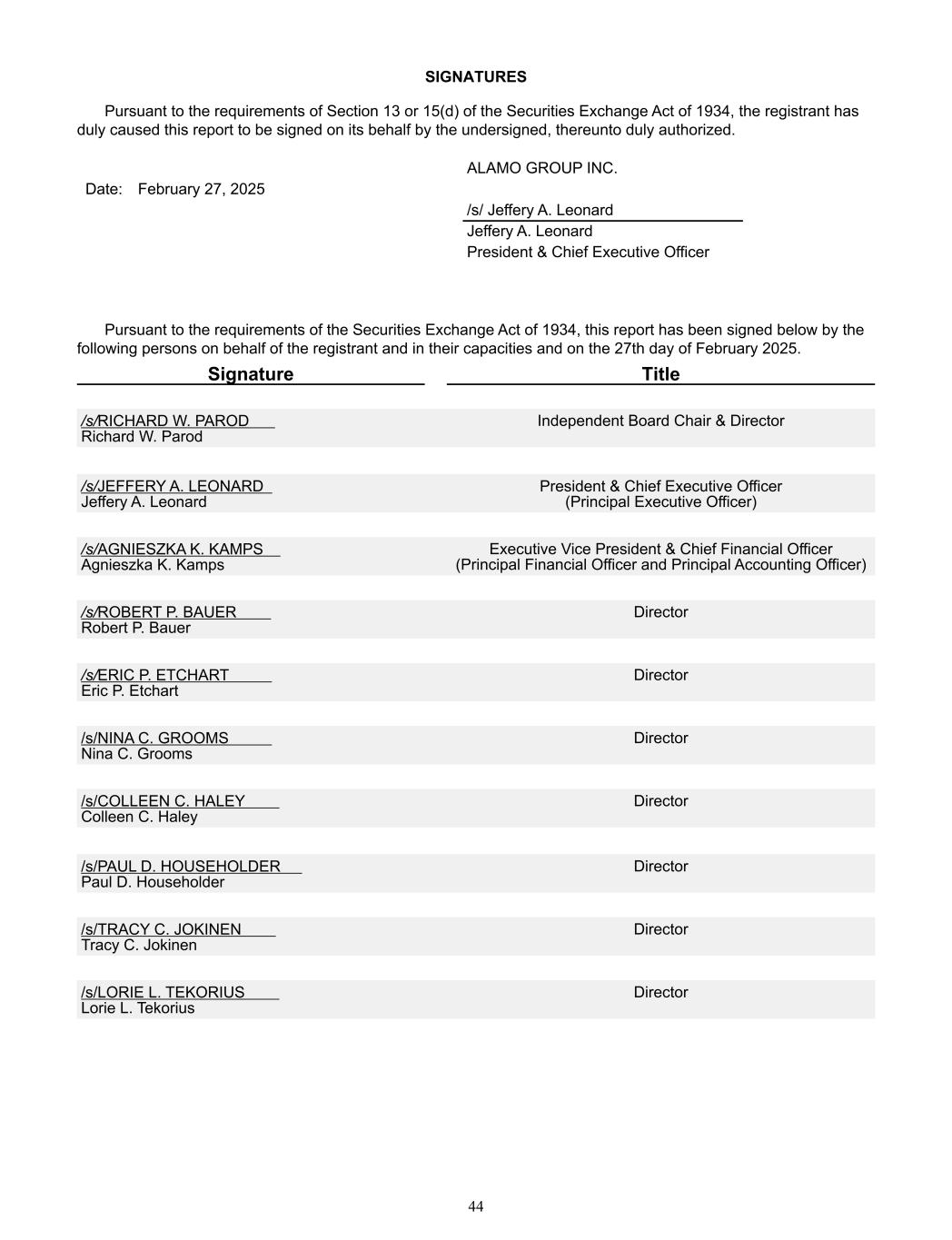 SIGNATURES  Pursuant to the requirements of Section 13 or 15(d) of the Securities Exchange Act of 1934, the registrant has  duly caused this report to be signed on its behalf by the undersigned, thereunto duly authorized.    ALAMO GROUP INC. Date: February 27, 2025    /s/ Jeffery A. Leonard  Jeffery A. Leonard  President & Chief Executive Officer    Pursuant to the requirements of the Securities Exchange Act of 1934, this report has been signed below by the  following persons on behalf of the registrant and in their capacities and on the 27th day of February 2025. Signature  Title     /s/RICHARD W. PAROD       Richard W. Parod Independent Board Chair & Director /s/JEFFERY A. LEONARD   Jeffery A. Leonard   President & Chief Executive Officer   (Principal Executive Officer)     /s/AGNIESZKA K. KAMPS     Agnieszka K. Kamps  Executive Vice President & Chief Financial Officer     (Principal Financial Officer and Principal Accounting Officer)     /s/ROBERT P. BAUER         Robert P. Bauer  Director /s/ERIC P. ETCHART           Eric P. Etchart  Director /s/NINA C. GROOMS               Nina C. Grooms  Director    /s/COLLEEN C. HALEY         Colleen C. Haley  Director /s/PAUL D. HOUSEHOLDER      Paul D. Householder Director /s/TRACY C. JOKINEN         Tracy C. Jokinen  Director /s/LORIE L. TEKORIUS         Lorie L. Tekorius Director   44