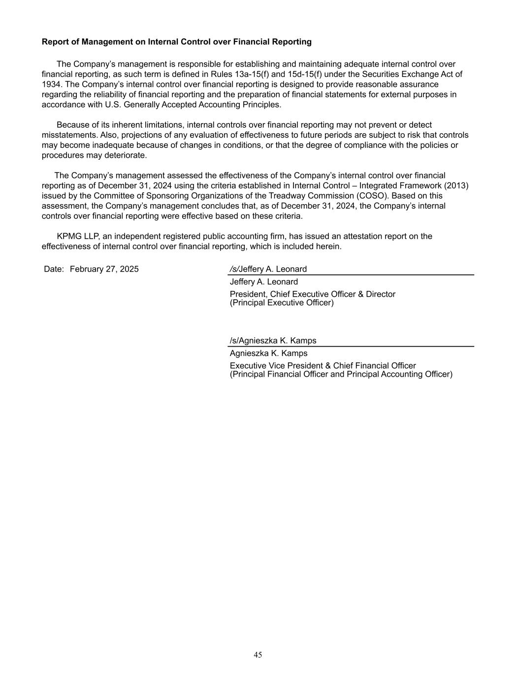 Report of Management on Internal Control over Financial Reporting    The Company’s management is responsible for establishing and maintaining adequate internal control over  financial reporting, as such term is defined in Rules 13a-15(f) and 15d-15(f) under the Securities Exchange Act of  1934. The Company’s internal control over financial reporting is designed to provide reasonable assurance  regarding the reliability of financial reporting and the preparation of financial statements for external purposes in  accordance with U.S. Generally Accepted Accounting Principles.    Because of its inherent limitations, internal controls over financial reporting may not prevent or detect  misstatements. Also, projections of any evaluation of effectiveness to future periods are subject to risk that controls  may become inadequate because of changes in conditions, or that the degree of compliance with the policies or  procedures may deteriorate.   The Company’s management assessed the effectiveness of the Company’s internal control over financial  reporting as of December 31, 2024 using the criteria established in Internal Control – Integrated Framework (2013)  issued by the Committee of Sponsoring Organizations of the Treadway Commission (COSO). Based on this  assessment, the Company’s management concludes that, as of December 31, 2024, the Company’s internal  controls over financial reporting were effective based on these criteria. KPMG LLP, an independent registered public accounting firm, has issued an attestation report on the  effectiveness of internal control over financial reporting, which is included herein.    Date: February 27, 2025 /s/Jeffery A. Leonard                        Jeffery A. Leonard         President, Chief Executive Officer & Director                       (Principal Executive Officer)      /s/Agnieszka K. Kamps Agnieszka K. Kamps  Executive Vice President & Chief Financial Officer           (Principal Financial Officer and Principal Accounting Officer)   45