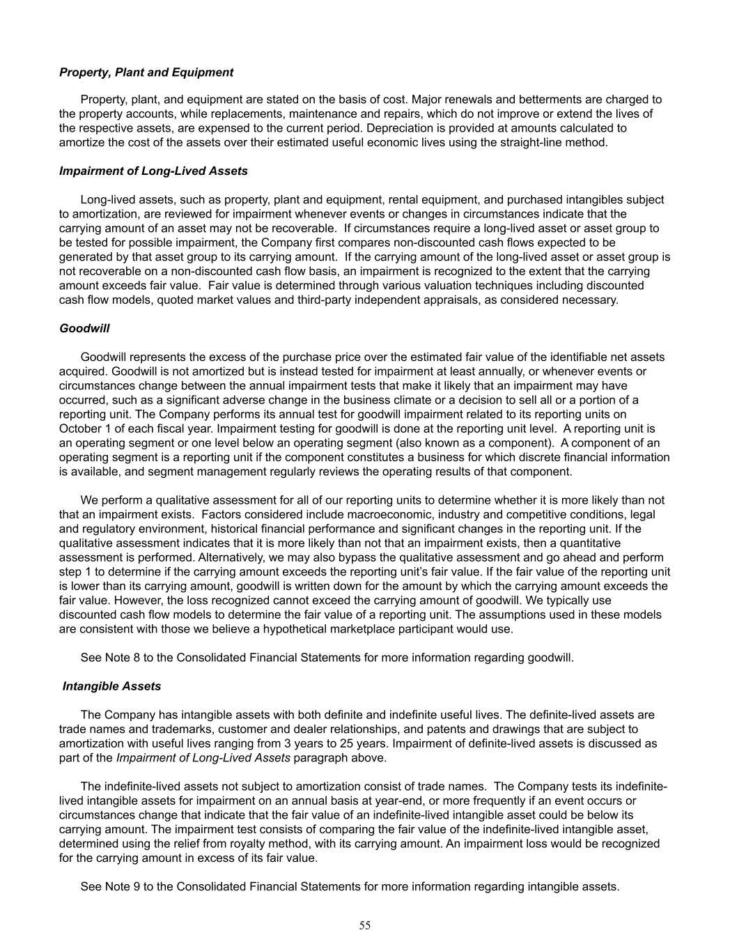 Property, Plant and Equipment Property, plant, and equipment are stated on the basis of cost. Major renewals and betterments are charged to  the property accounts, while replacements, maintenance and repairs, which do not improve or extend the lives of  the respective assets, are expensed to the current period. Depreciation is provided at amounts calculated to  amortize the cost of the assets over their estimated useful economic lives using the straight-line method. Impairment of Long-Lived Assets Long-lived assets, such as property, plant and equipment, rental equipment, and purchased intangibles subject  to amortization, are reviewed for impairment whenever events or changes in circumstances indicate that the  carrying amount of an asset may not be recoverable.  If circumstances require a long-lived asset or asset group to  be tested for possible impairment, the Company first compares non-discounted cash flows expected to be  generated by that asset group to its carrying amount.  If the carrying amount of the long-lived asset or asset group is  not recoverable on a non-discounted cash flow basis, an impairment is recognized to the extent that the carrying  amount exceeds fair value.  Fair value is determined through various valuation techniques including discounted  cash flow models, quoted market values and third-party independent appraisals, as considered necessary.  Goodwill Goodwill represents the excess of the purchase price over the estimated fair value of the identifiable net assets  acquired. Goodwill is not amortized but is instead tested for impairment at least annually, or whenever events or  circumstances change between the annual impairment tests that make it likely that an impairment may have  occurred, such as a significant adverse change in the business climate or a decision to sell all or a portion of a  reporting unit. The Company performs its annual test for goodwill impairment related to its reporting units on  October 1 of each fiscal year. Impairment testing for goodwill is done at the reporting unit level.  A reporting unit is  an operating segment or one level below an operating segment (also known as a component).  A component of an  operating segment is a reporting unit if the component constitutes a business for which discrete financial information  is available, and segment management regularly reviews the operating results of that component.  We perform a qualitative assessment for all of our reporting units to determine whether it is more likely than not  that an impairment exists.  Factors considered include macroeconomic, industry and competitive conditions, legal  and regulatory environment, historical financial performance and significant changes in the reporting unit. If the  qualitative assessment indicates that it is more likely than not that an impairment exists, then a quantitative  assessment is performed. Alternatively, we may also bypass the qualitative assessment and go ahead and perform  step 1 to determine if the carrying amount exceeds the reporting unit’s fair value. If the fair value of the reporting unit  is lower than its carrying amount, goodwill is written down for the amount by which the carrying amount exceeds the  fair value. However, the loss recognized cannot exceed the carrying amount of goodwill. We typically use  discounted cash flow models to determine the fair value of a reporting unit. The assumptions used in these models  are consistent with those we believe a hypothetical marketplace participant would use. See Note 8 to the Consolidated Financial Statements for more information regarding goodwill.    Intangible Assets     The Company has intangible assets with both definite and indefinite useful lives. The definite-lived assets are  trade names and trademarks, customer and dealer relationships, and patents and drawings that are subject to  amortization with useful lives ranging from 3 years to 25 years. Impairment of definite-lived assets is discussed as  part of the Impairment of Long-Lived Assets paragraph above.    The indefinite-lived assets not subject to amortization consist of trade names.  The Company tests its indefinite- lived intangible assets for impairment on an annual basis at year-end, or more frequently if an event occurs or  circumstances change that indicate that the fair value of an indefinite-lived intangible asset could be below its  carrying amount. The impairment test consists of comparing the fair value of the indefinite-lived intangible asset,  determined using the relief from royalty method, with its carrying amount. An impairment loss would be recognized  for the carrying amount in excess of its fair value. See Note 9 to the Consolidated Financial Statements for more information regarding intangible assets. 55