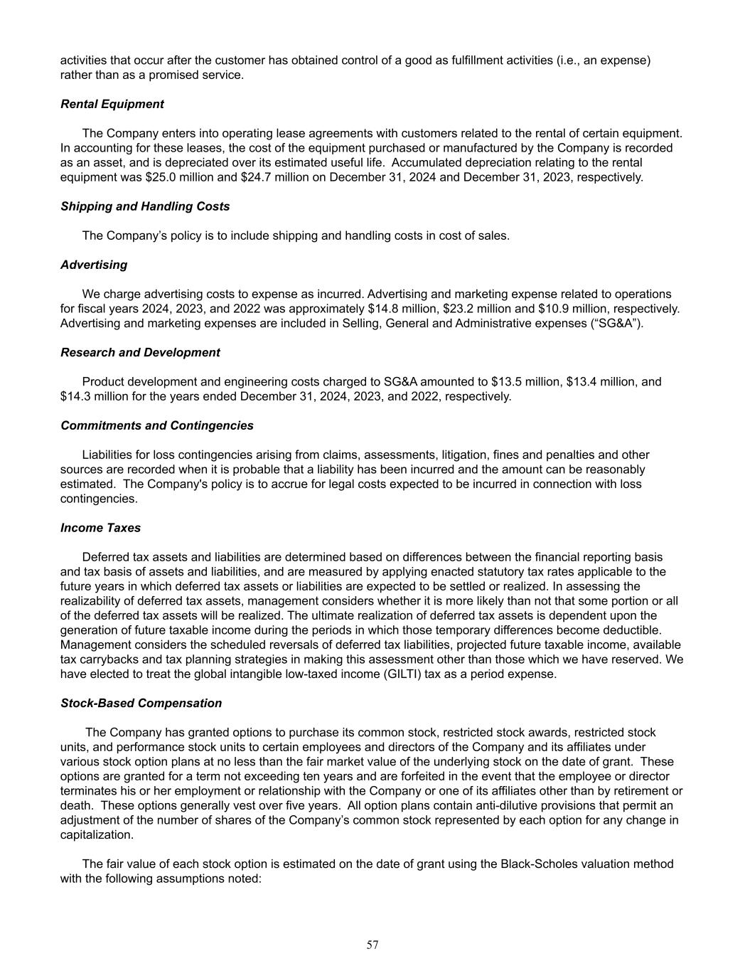 activities that occur after the customer has obtained control of a good as fulfillment activities (i.e., an expense)  rather than as a promised service.   Rental Equipment The Company enters into operating lease agreements with customers related to the rental of certain equipment.   In accounting for these leases, the cost of the equipment purchased or manufactured by the Company is recorded  as an asset, and is depreciated over its estimated useful life.  Accumulated depreciation relating to the rental  equipment was $25.0 million and $24.7 million on December 31, 2024 and December 31, 2023, respectively.   Shipping and Handling Costs   The Company’s policy is to include shipping and handling costs in cost of sales.   Advertising We charge advertising costs to expense as incurred. Advertising and marketing expense related to operations  for fiscal years 2024, 2023, and 2022 was approximately $14.8 million, $23.2 million and $10.9 million, respectively.  Advertising and marketing expenses are included in Selling, General and Administrative expenses (“SG&A”). Research and Development Product development and engineering costs charged to SG&A amounted to $13.5 million, $13.4 million, and  $14.3 million for the years ended December 31, 2024, 2023, and 2022, respectively. Commitments and Contingencies Liabilities for loss contingencies arising from claims, assessments, litigation, fines and penalties and other  sources are recorded when it is probable that a liability has been incurred and the amount can be reasonably  estimated.  The Company's policy is to accrue for legal costs expected to be incurred in connection with loss  contingencies. Income Taxes Deferred tax assets and liabilities are determined based on differences between the financial reporting basis  and tax basis of assets and liabilities, and are measured by applying enacted statutory tax rates applicable to the  future years in which deferred tax assets or liabilities are expected to be settled or realized. In assessing the  realizability of deferred tax assets, management considers whether it is more likely than not that some portion or all  of the deferred tax assets will be realized. The ultimate realization of deferred tax assets is dependent upon the  generation of future taxable income during the periods in which those temporary differences become deductible.  Management considers the scheduled reversals of deferred tax liabilities, projected future taxable income, available  tax carrybacks and tax planning strategies in making this assessment other than those which we have reserved. We  have elected to treat the global intangible low-taxed income (GILTI) tax as a period expense. Stock-Based Compensation    The Company has granted options to purchase its common stock, restricted stock awards, restricted stock  units, and performance stock units to certain employees and directors of the Company and its affiliates under  various stock option plans at no less than the fair market value of the underlying stock on the date of grant.  These  options are granted for a term not exceeding ten years and are forfeited in the event that the employee or director  terminates his or her employment or relationship with the Company or one of its affiliates other than by retirement or  death.  These options generally vest over five years.  All option plans contain anti-dilutive provisions that permit an  adjustment of the number of shares of the Company’s common stock represented by each option for any change in  capitalization.  The fair value of each stock option is estimated on the date of grant using the Black-Scholes valuation method  with the following assumptions noted: 57