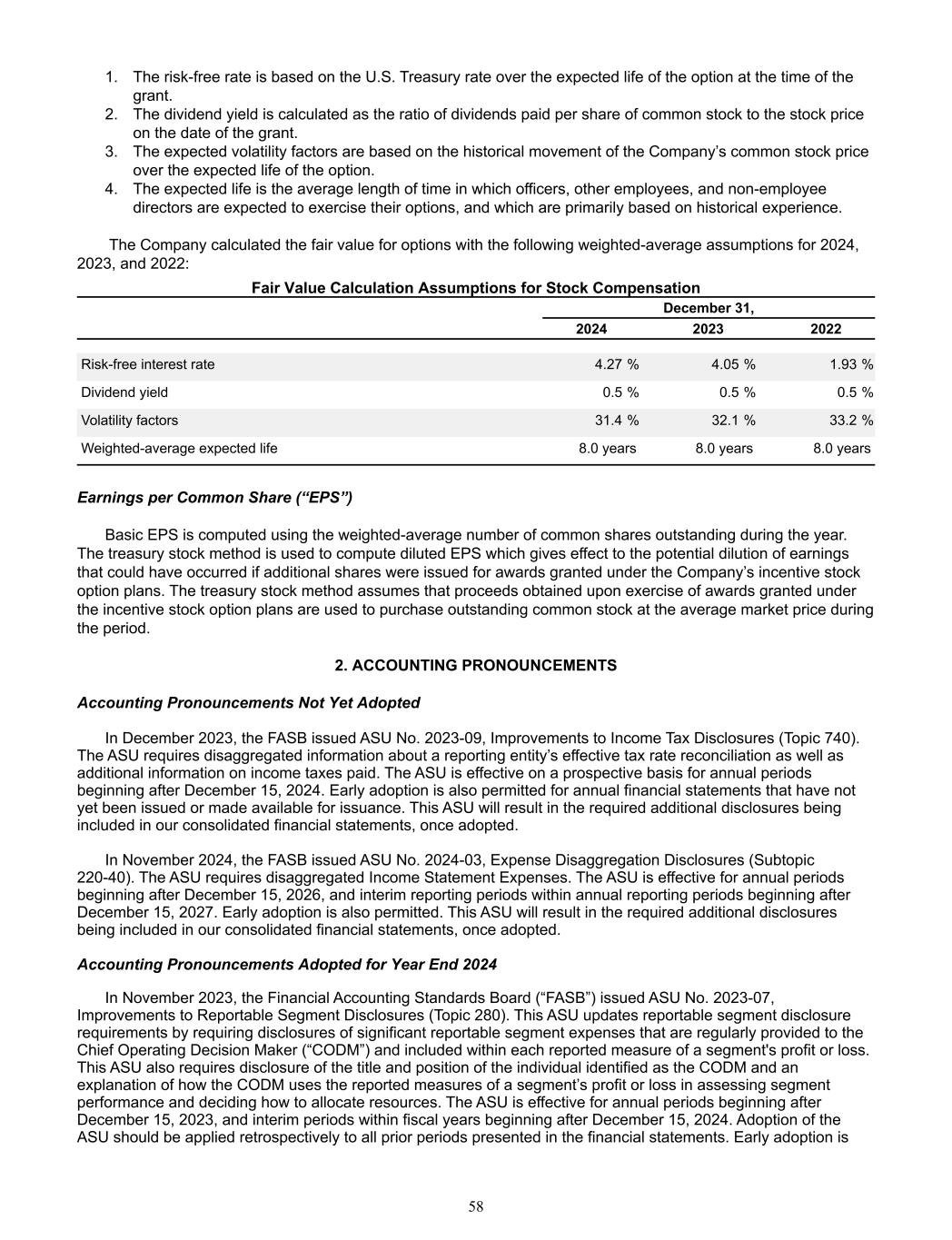 1. The risk-free rate is based on the U.S. Treasury rate over the expected life of the option at the time of the  grant. 2. The dividend yield is calculated as the ratio of dividends paid per share of common stock to the stock price  on the date of the grant. 3. The expected volatility factors are based on the historical movement of the Company’s common stock price  over the expected life of the option. 4. The expected life is the average length of time in which officers, other employees, and non-employee  directors are expected to exercise their options, and which are primarily based on historical experience.     The Company calculated the fair value for options with the following weighted-average assumptions for 2024,  2023, and 2022:  December 31,  2024 2023 2022 Risk-free interest rate  4.27 %  4.05 %  1.93 % Dividend yield  0.5 %  0.5 %  0.5 % Volatility factors  31.4 %  32.1 %  33.2 % Weighted-average expected life 8.0 years 8.0 years 8.0 years Fair Value Calculation Assumptions for Stock Compensation Earnings per Common Share (“EPS”) Basic EPS is computed using the weighted-average number of common shares outstanding during the year.  The treasury stock method is used to compute diluted EPS which gives effect to the potential dilution of earnings  that could have occurred if additional shares were issued for awards granted under the Company’s incentive stock  option plans. The treasury stock method assumes that proceeds obtained upon exercise of awards granted under  the incentive stock option plans are used to purchase outstanding common stock at the average market price during  the period. 2. ACCOUNTING PRONOUNCEMENTS Accounting Pronouncements Not Yet Adopted In December 2023, the FASB issued ASU No. 2023-09, Improvements to Income Tax Disclosures (Topic 740).  The ASU requires disaggregated information about a reporting entity’s effective tax rate reconciliation as well as  additional information on income taxes paid. The ASU is effective on a prospective basis for annual periods  beginning after December 15, 2024. Early adoption is also permitted for annual financial statements that have not  yet been issued or made available for issuance. This ASU will result in the required additional disclosures being  included in our consolidated financial statements, once adopted. In November 2024, the FASB issued ASU No. 2024-03, Expense Disaggregation Disclosures (Subtopic  220-40). The ASU requires disaggregated Income Statement Expenses. The ASU is effective for annual periods  beginning after December 15, 2026, and interim reporting periods within annual reporting periods beginning after  December 15, 2027. Early adoption is also permitted. This ASU will result in the required additional disclosures  being included in our consolidated financial statements, once adopted. Accounting Pronouncements Adopted for Year End 2024 In November 2023, the Financial Accounting Standards Board (“FASB”) issued ASU No. 2023-07,  Improvements to Reportable Segment Disclosures (Topic 280). This ASU updates reportable segment disclosure  requirements by requiring disclosures of significant reportable segment expenses that are regularly provided to the  Chief Operating Decision Maker (“CODM”) and included within each reported measure of a segment's profit or loss.  This ASU also requires disclosure of the title and position of the individual identified as the CODM and an  explanation of how the CODM uses the reported measures of a segment’s profit or loss in assessing segment  performance and deciding how to allocate resources. The ASU is effective for annual periods beginning after  December 15, 2023, and interim periods within fiscal years beginning after December 15, 2024. Adoption of the  ASU should be applied retrospectively to all prior periods presented in the financial statements. Early adoption is  58