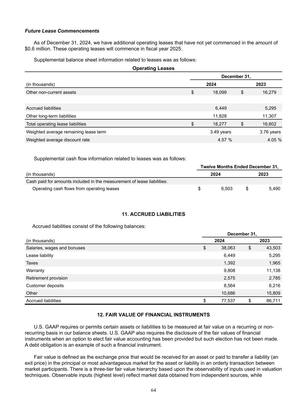 Future Lease Commencements As of December 31, 2024, we have additional operating leases that have not yet commenced in the amount of  $0.6 million. These operating leases will commence in fiscal year 2025. Supplemental balance sheet information related to leases was as follows: Operating Leases December 31, (in thousands) 2024 2023 Other non-current assets $ 18,099 $ 16,279  Accrued liabilities  6,449  5,295  Other long-term liabilities  11,828  11,307  Total operating lease liabilities $ 18,277 $ 16,602  Weighted average remaining lease term 3.49 years 3.76 years Weighted average discount rate  4.57 %  4.05 % Supplemental cash flow information related to leases was as follows: Twelve Months Ended December 31, (in thousands) 2024 2023 Cash paid for amounts included in the measurement of lease liabilities:      Operating cash flows from operating leases $ 6,503 $ 5,490  11. ACCRUED LIABILITIES Accrued liabilities consist of the following balances:  December 31, (in thousands) 2024 2023 Salaries, wages and bonuses $ 38,063 $ 43,503  Lease liability  6,449  5,295  Taxes  1,392  1,965  Warranty  9,808  11,138  Retirement provision  2,575  2,785  Customer deposits  8,564  6,216  Other  10,686  15,809  Accrued liabilities $ 77,537 $ 86,711  12. FAIR VALUE OF FINANCIAL INSTRUMENTS  U.S. GAAP requires or permits certain assets or liabilities to be measured at fair value on a recurring or non-  recurring basis in our balance sheets. U.S. GAAP also requires the disclosure of the fair values of financial  instruments when an option to elect fair value accounting has been provided but such election has not been made.   A debt obligation is an example of such a financial instrument. Fair value is defined as the exchange price that would be received for an asset or paid to transfer a liability (an  exit price) in the principal or most advantageous market for the asset or liability in an orderly transaction between  market participants. There is a three-tier fair value hierarchy based upon the observability of inputs used in valuation  techniques. Observable inputs (highest level) reflect market data obtained from independent sources, while  64