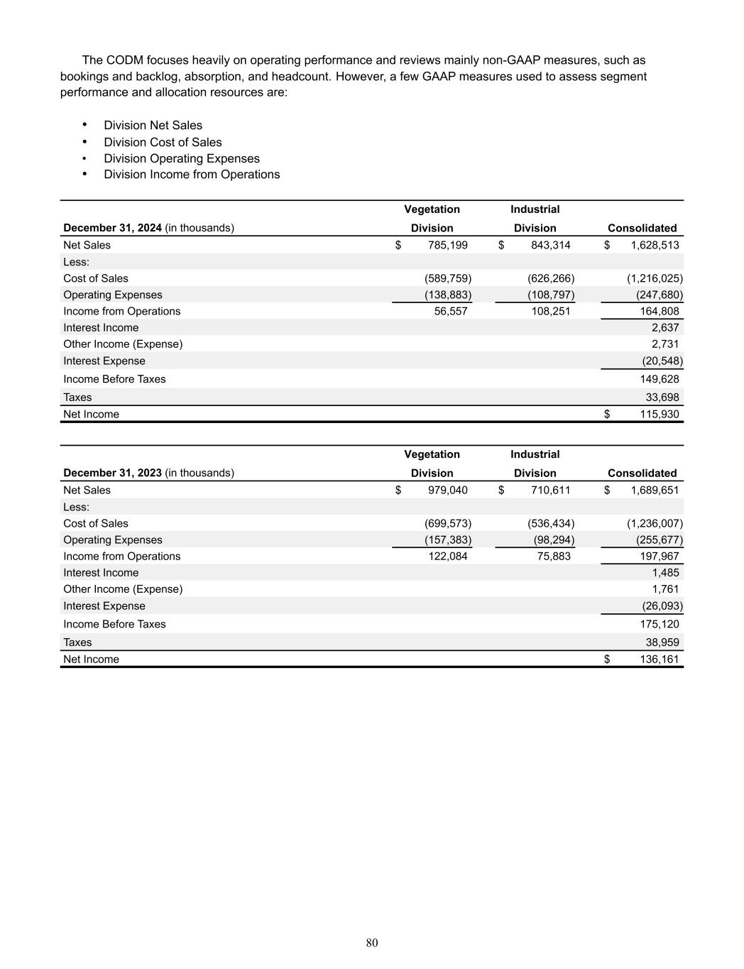 The CODM focuses heavily on operating performance and reviews mainly non-GAAP measures, such as  bookings and backlog, absorption, and headcount. However, a few GAAP measures used to assess segment  performance and allocation resources are: • Division Net Sales • Division Cost of Sales • Division Operating Expenses • Division Income from Operations    Vegetation Industrial December 31, 2024 (in thousands) Division Division Consolidated Net Sales $ 785,199 $ 843,314 $ 1,628,513  Less: Cost of Sales  (589,759)  (626,266)  (1,216,025)  Operating Expenses  (138,883)  (108,797)  (247,680)  Income from Operations  56,557  108,251  164,808  Interest Income  2,637  Other Income (Expense)  2,731  Interest Expense  (20,548)  Income Before Taxes  149,628  Taxes    33,698  Net Income $ 115,930   Vegetation Industrial December 31, 2023 (in thousands) Division Division Consolidated Net Sales $ 979,040 $ 710,611 $ 1,689,651  Less: Cost of Sales  (699,573)  (536,434)  (1,236,007)  Operating Expenses  (157,383)  (98,294)  (255,677)  Income from Operations  122,084  75,883  197,967  Interest Income  1,485  Other Income (Expense)  1,761  Interest Expense  (26,093)  Income Before Taxes  175,120  Taxes    38,959  Net Income $ 136,161  80